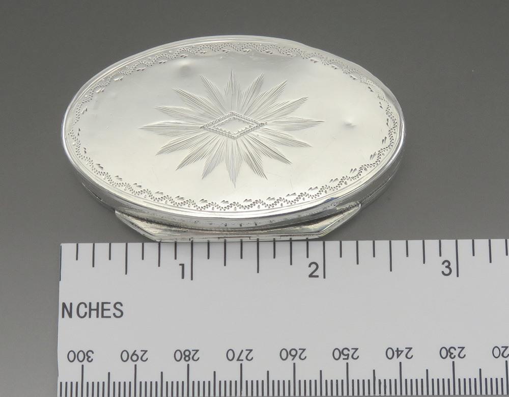 Presented is a fine antique silver snuff box made in France dating between 1809 and 1819. This is completely hand engraved, ninety-five percent silver, which is of a higher purity than sterling, called "first standard silver". The engravings are very distinct and artfully done. The top of the box features a hat amidst musical instruments and foliage. The bottom bears a very finely etched, 16-point star, which you can see in our photo showing the ruler. There are a variety of lovely decorative borders lining every edge of the outer surfaces.