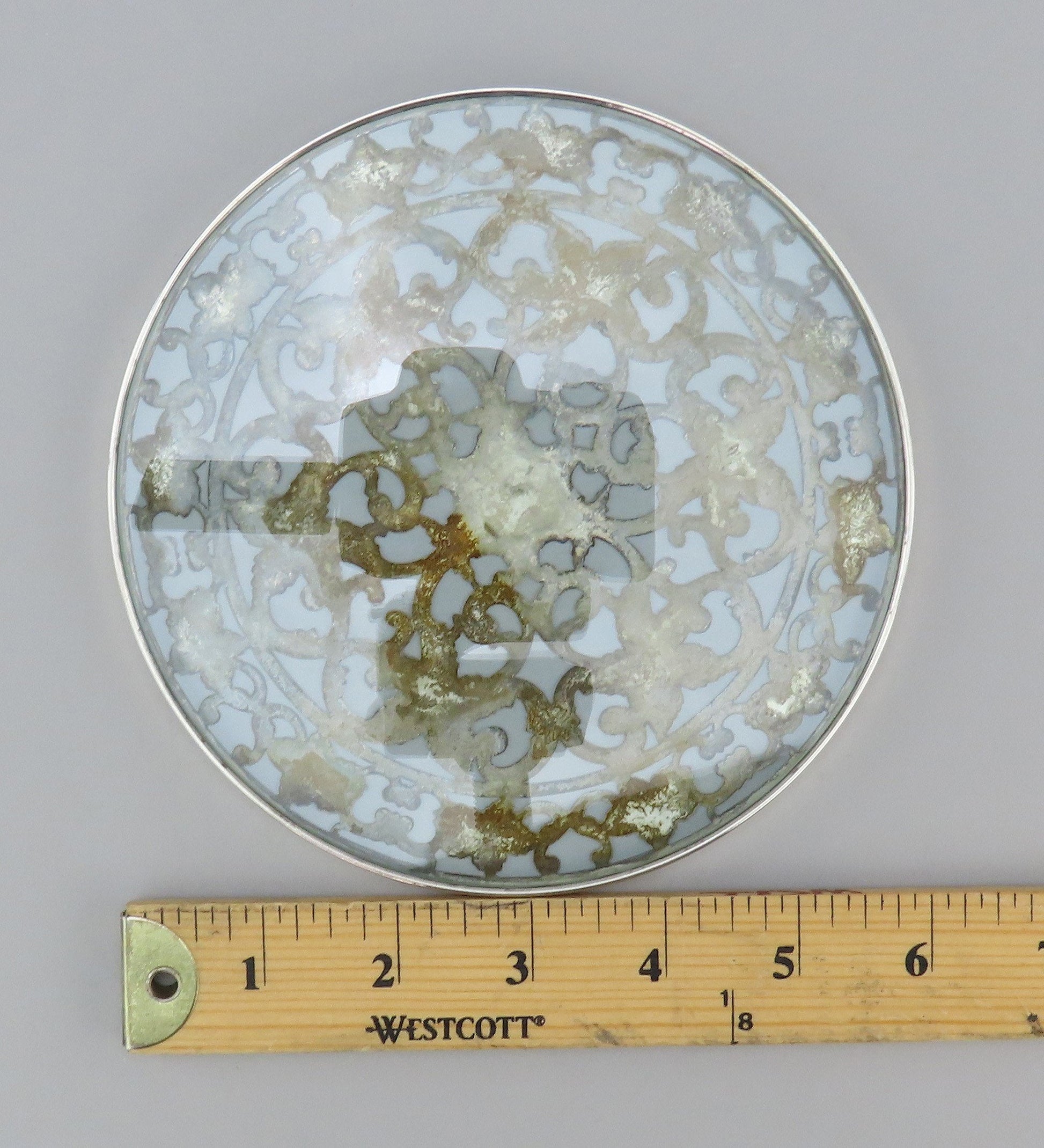 This trivet is in great overall condition. There are no losses to the sterling silver overlay. The underside of the glass has almost no surface wear/shelf wear whatsoever, due to the thick silver edge which keeps the glass from making contact with surfaces. There are no breaks to the glass, no monograms, no monogram removals, and no repairs.