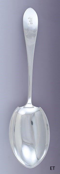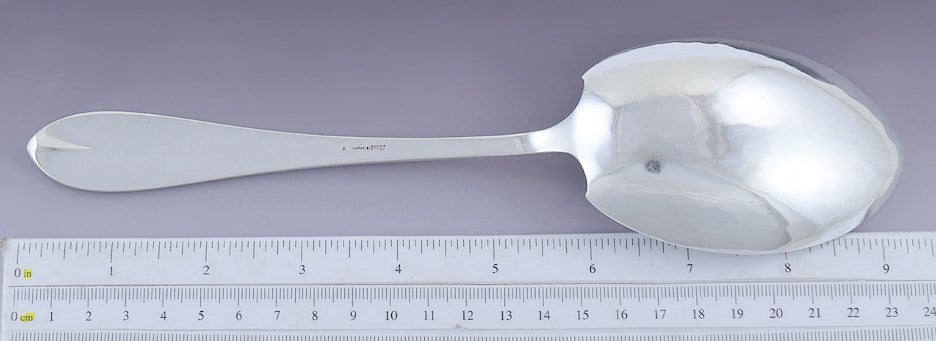 Presented is a lovely Arthur Stone sterling silver serving spoon or scoop. This piece was made prior to 1937. This piece is finely made by hand, with the marks of hand hammering faintly visible in the bowl. This is a good size serving piece, suitable for casseroles, berries, mashed potatoes, or whatever other serving purpose you like. The terminal of the handle has a monogram of F in Gothic script.