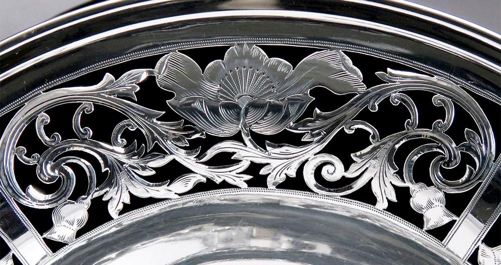 Presented is a lovely sterling silver low tazza or footed bowl. This piece was made by Birks, a Canadian silver maker, and dates to the late 1800s or early 1900s. The bowl is done in a round form, with a beautifully pierced openwork border of thistles and foliate scrollwork vines. The openwork is very well done, with finely hand engraved detailing and texturing.