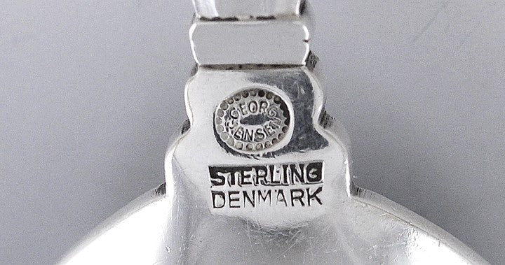 Both pieces are in good condition. There are no bends, no monograms, no monogram removals and no repairs. Both are hallmarked on the reverse with the maker's mark for Georg Jensen, as well as the words 'sterling' and 'Denmark'. The fork is 5 7/8 inches and the spoon is 4 inches long.