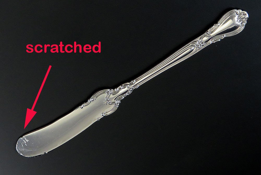 This set is in great overall condition. The details of the pattern are nice and crisp. One of the butter spreaders has some nicks to it, like it has met with the garbage disposal at some point in the past. There are no other damages, no splits, no dents, no monograms, no monogram removals, and no repairs.