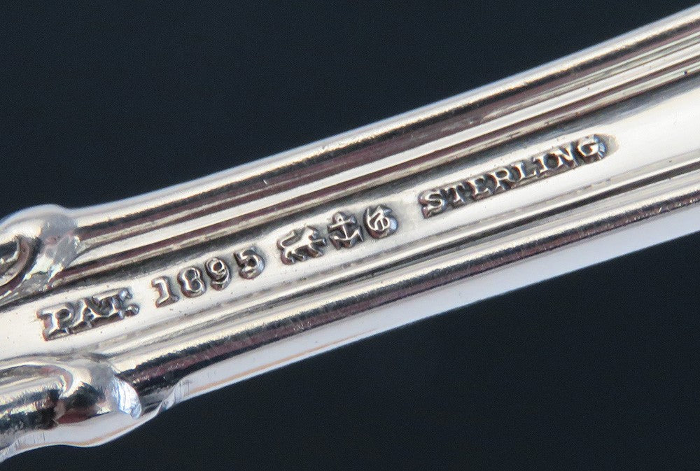 Each non-knife piece is stamped with the Gorham maker's mark as well as sterling, some with the old 'pat. 1895' date as well. The knives are marked Gorham, sterling handle, and stainless blade.