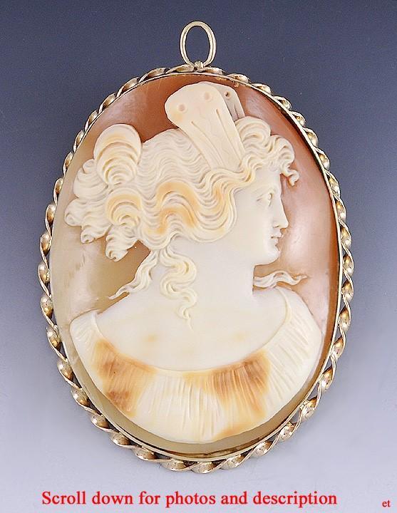 Fine Large Carved Cameo 14k Gold Rope Setting Pendant Pin Brooch