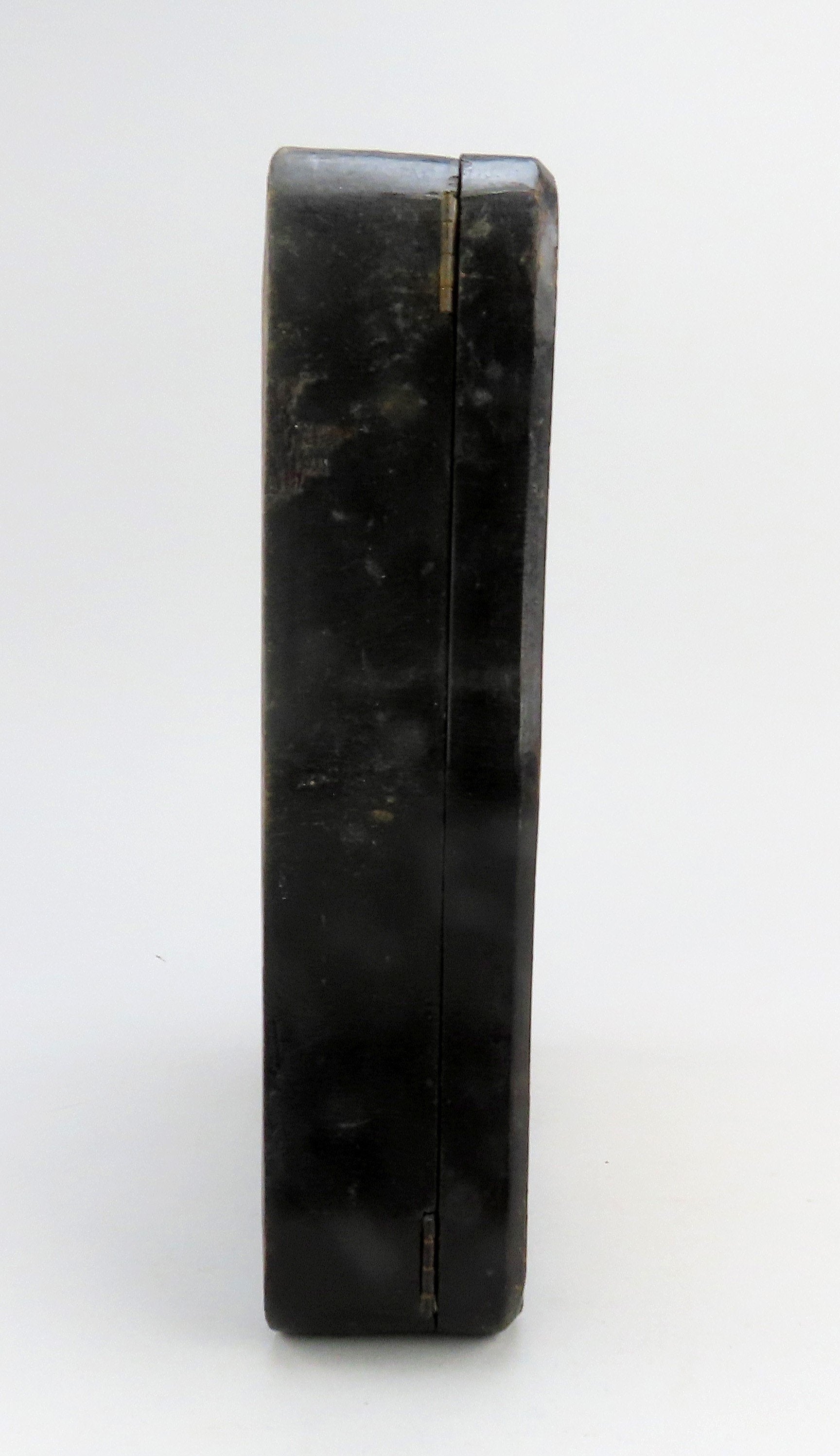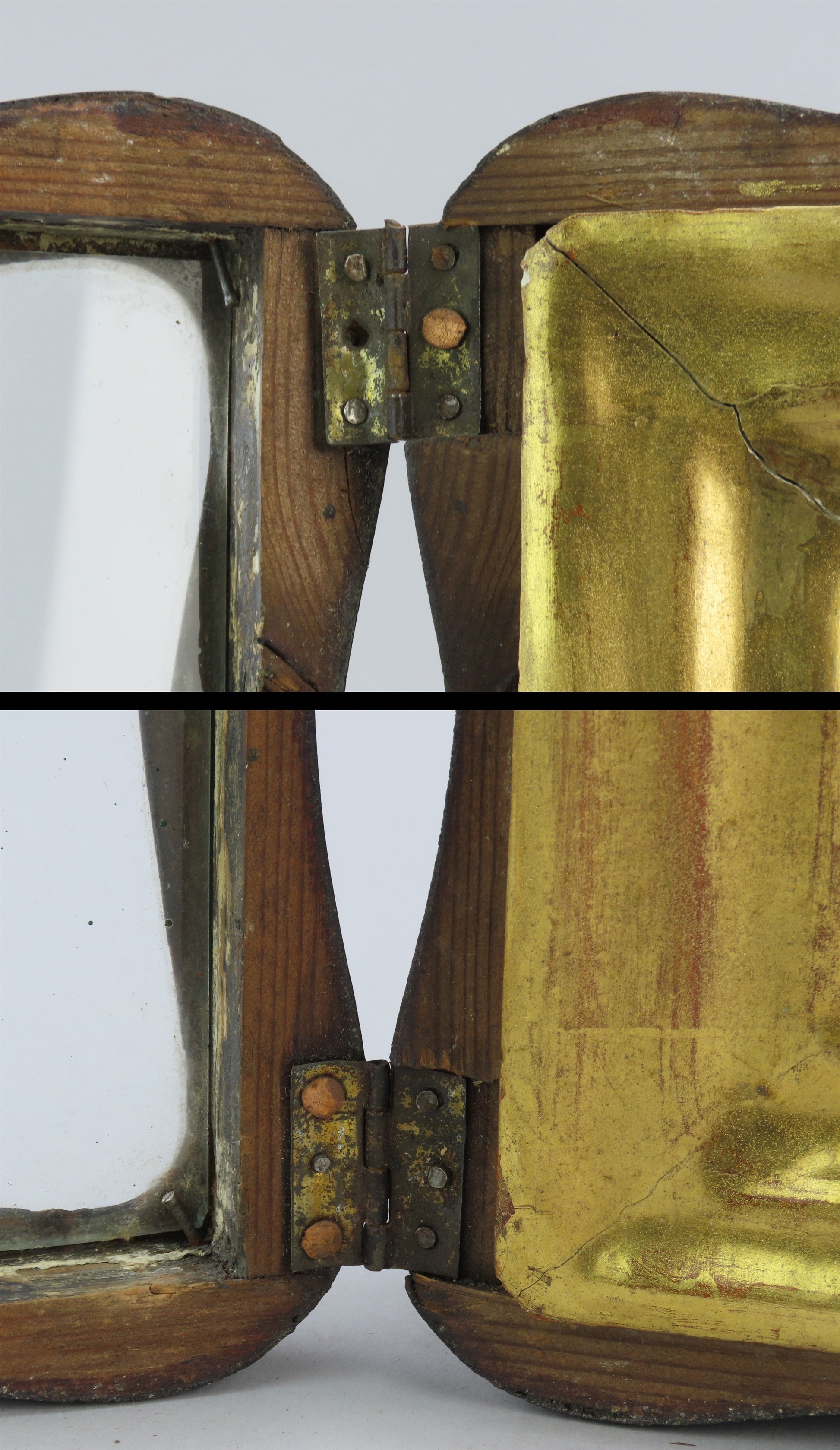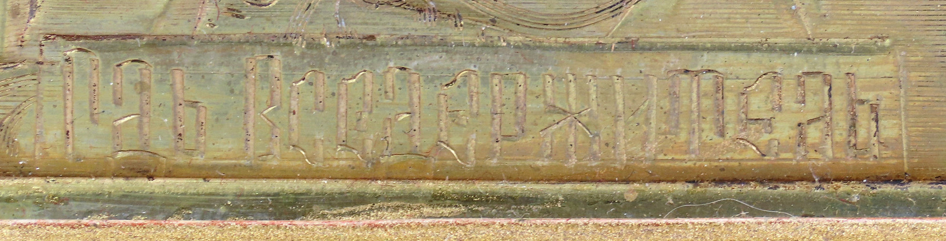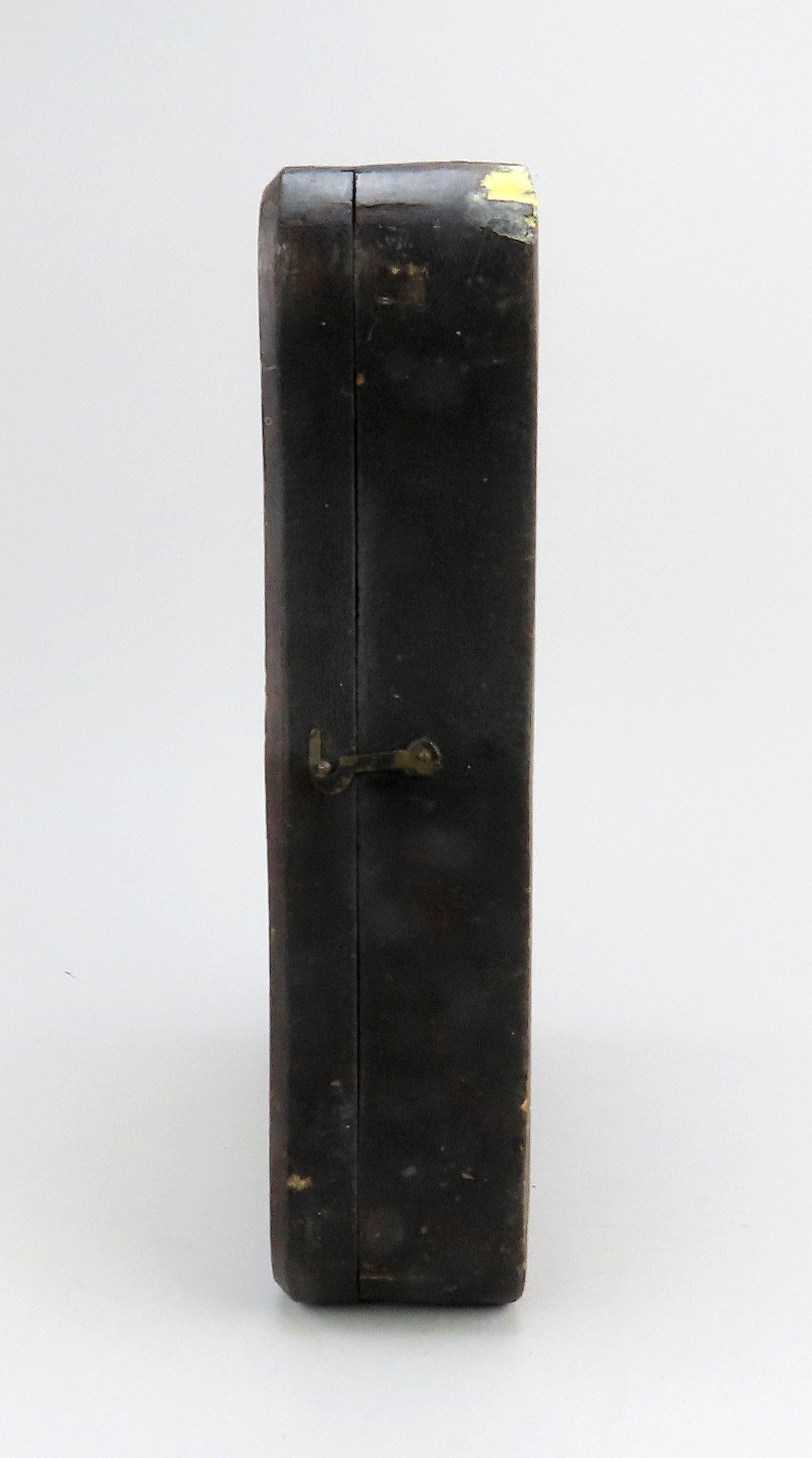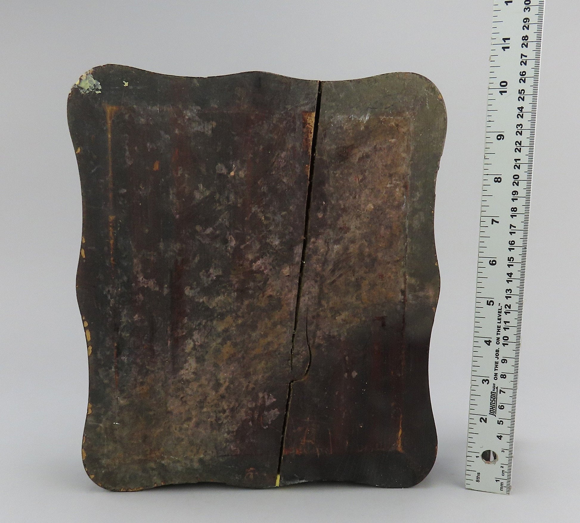 There are no hallmarks or stamps that we can find, so we are not guaranteeing this piece as silver, though it is made very much in the style of other icons done in silver and is a high quality piece. This piece is in great overall condition. The icon itself is in great shape, with just a little loss to the paint at the bridge of his nose and on one finger. The gilt wood frame inside is in good shape. The glass-fronted case has some wear and loss to the to the veneer, particularly at the upper corner shown in the ninth photograph, as well as an age split to the back, visible in the seventh photograph, which has a glue repair at the bottom; the case still feels quite sound.
