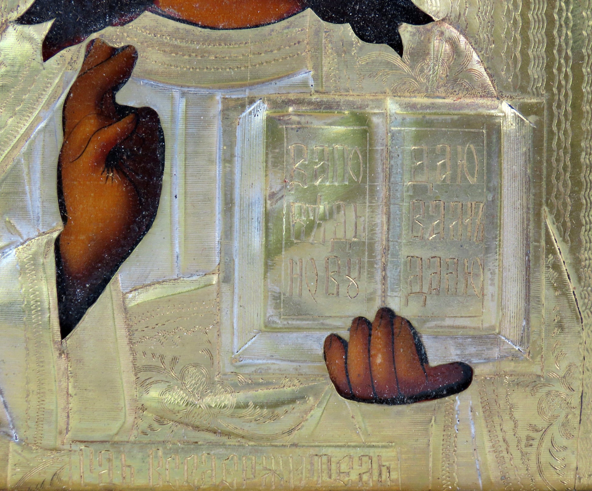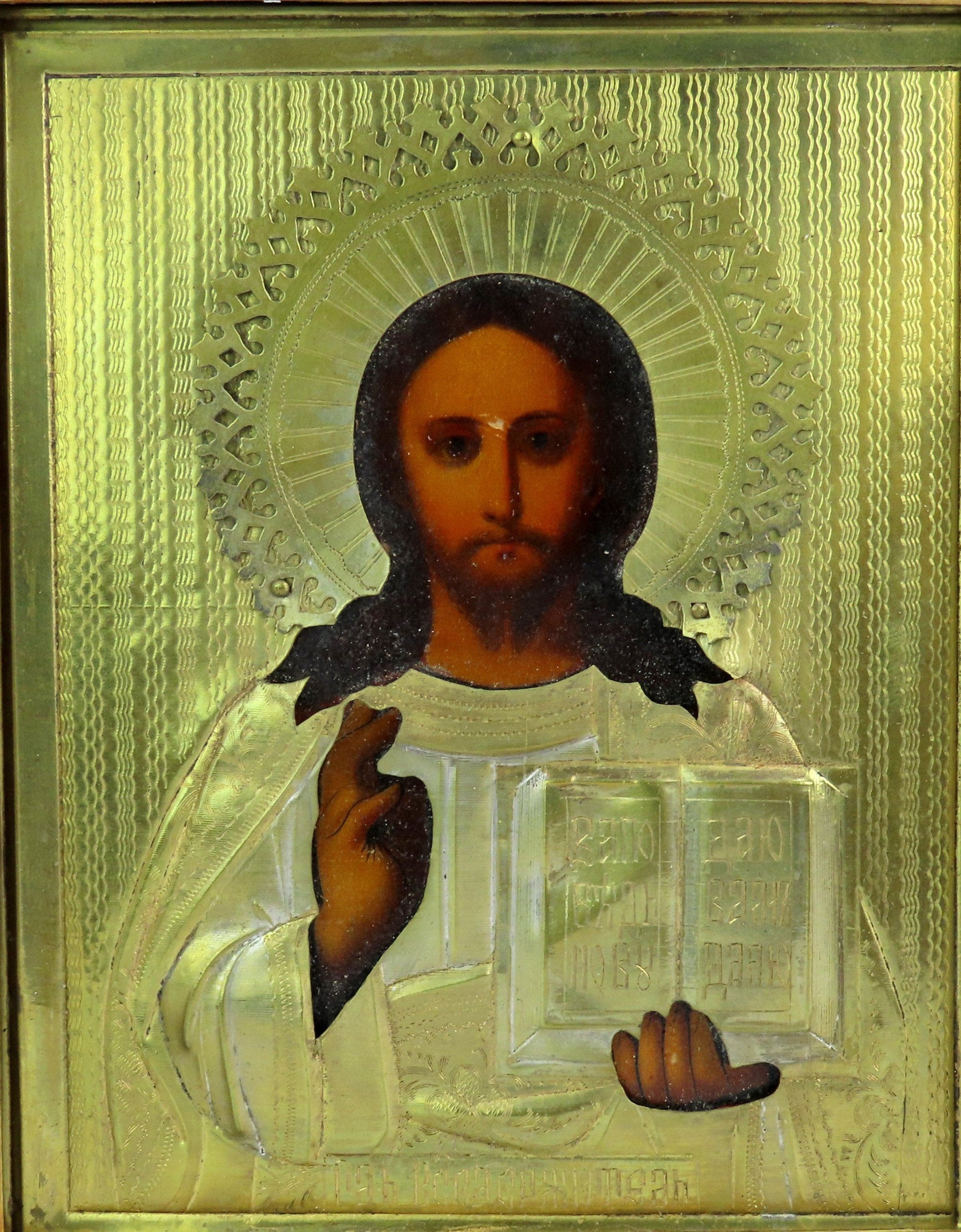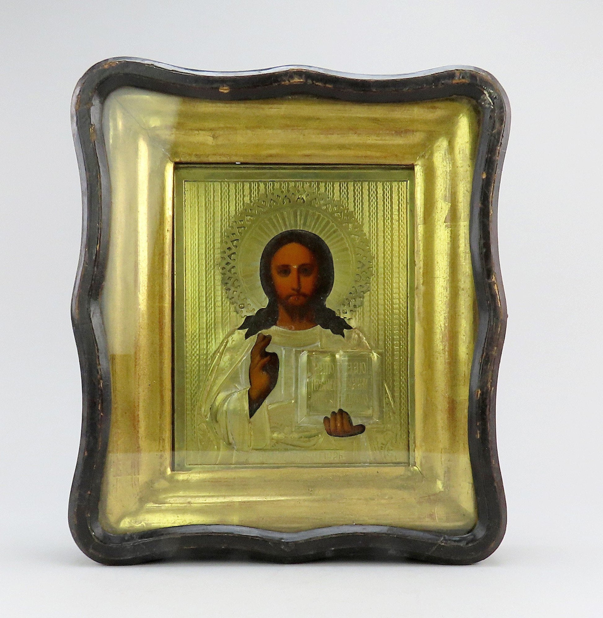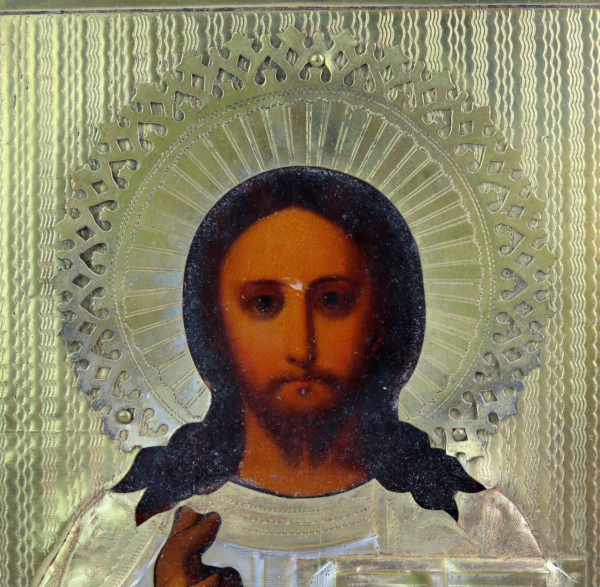 Fine Late 1800s/Early 1900s Russian Gilt Metalwork Framed Icon of Jesus