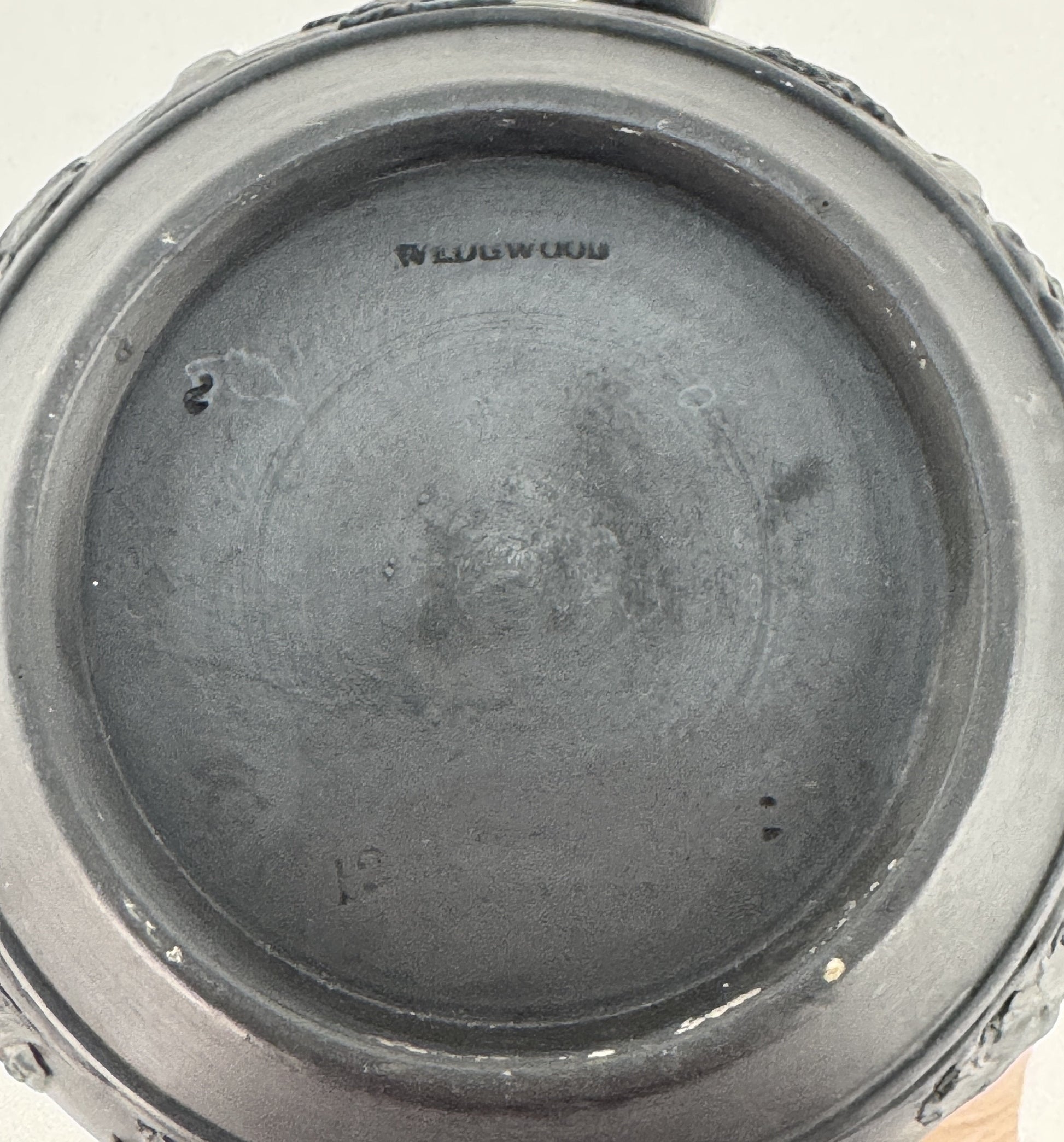 Presented as a fine quality English teapot by Wedgwood. This black basalt piece was made between 1840 through the 1880s. It is hallmarked on the bottom with the Wedgwood stamp. There are nice classical decorations around the entire pot. The color of the black is lighter in some spots and darker in other spots. Please see all the photographs. We have not tried to clean this item up, perhaps it could be cleaned more. The interior of the pot is glazed. It is quite usable.