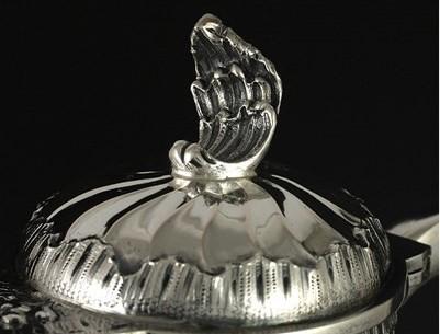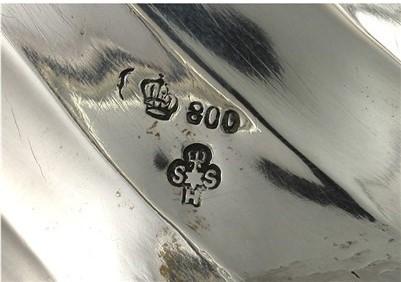 The pitchers are marked with a crescent moon, a crown, 800 for .800 purity silver and the maker's mark S, S, H, and a crown arranged in a cross pattern with a star in the middle for the makers Storck & Sinsheimer.