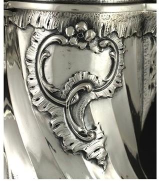 Presented is an attractive pair of antique German hand blown cut glass and silver wine ewers or pitchers. The hand blown glass on the body is cut into a swirl pattern. The silver on the handle, neck, and lid also has a swirl pattern. There is the monogram KE with a crown above inside the cartouche. The crown over the monogram most likely indicates that this belonged to a noble family with a title. The silver work is textured and detailed in the rococo style. The lid hinges work well. The inside of the top is gilded. The silver work is really lovely on this pair and the two together make for a very attractive sight. The pitchers were made between 1874-1910.