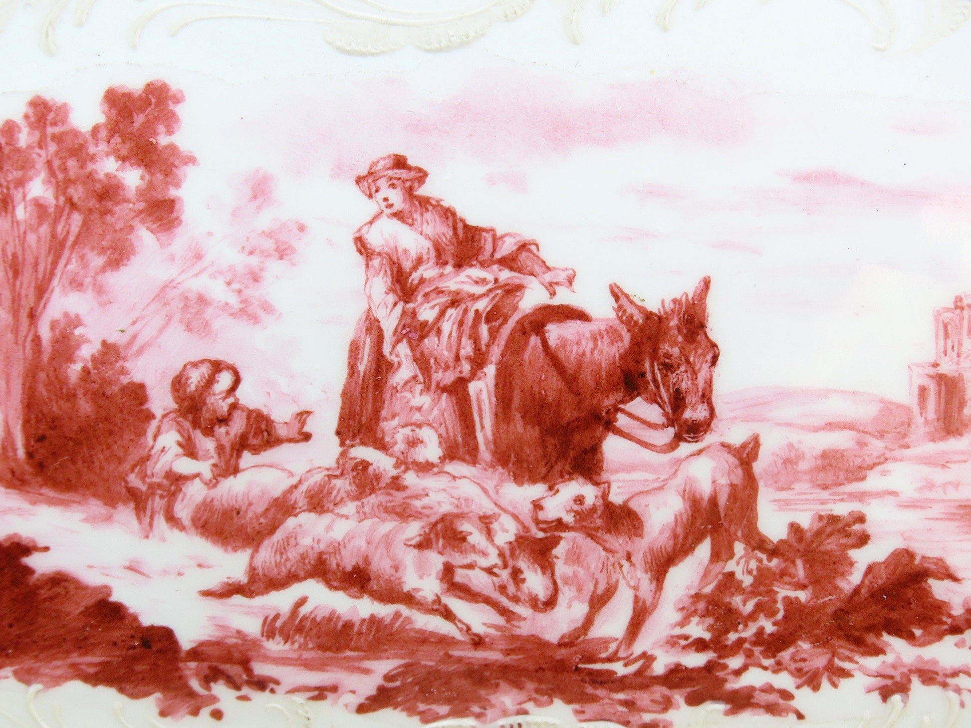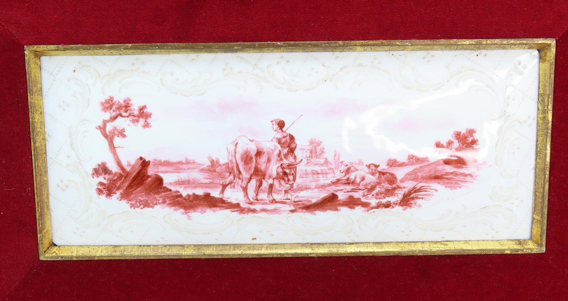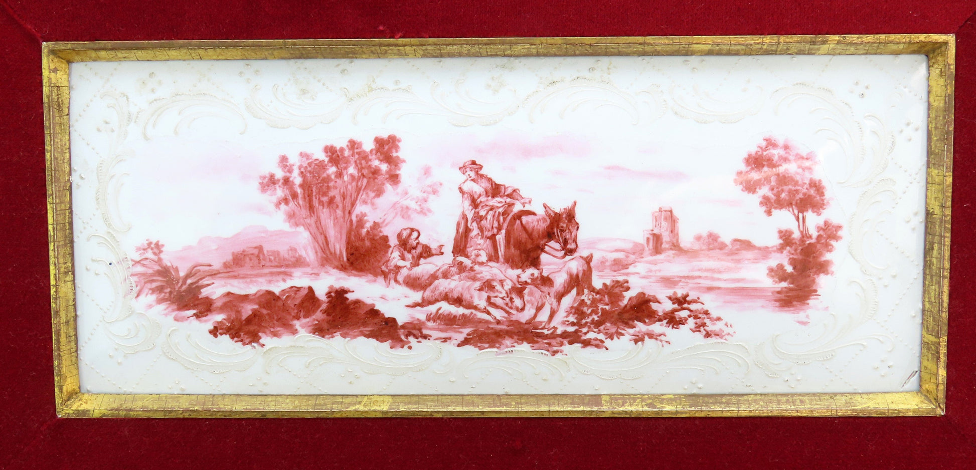 Presented is a wonderful pair of antique French enamel plaques in frames, dating to the 18th or 19th century. The plaques are done in shades of pink surrounded by raised white Rococo scrollwork designs. Both depict charming countryside scenes, one of a woman riding a donkey with sheep and a dog nearby, the other of a shepherd woman with bull and sheep. The plaques are in beautiful gilt wood frames with rich red velvet matting surrounding the plaques themselves, with a very opulent look. The backs have little triangular loops for hanging.