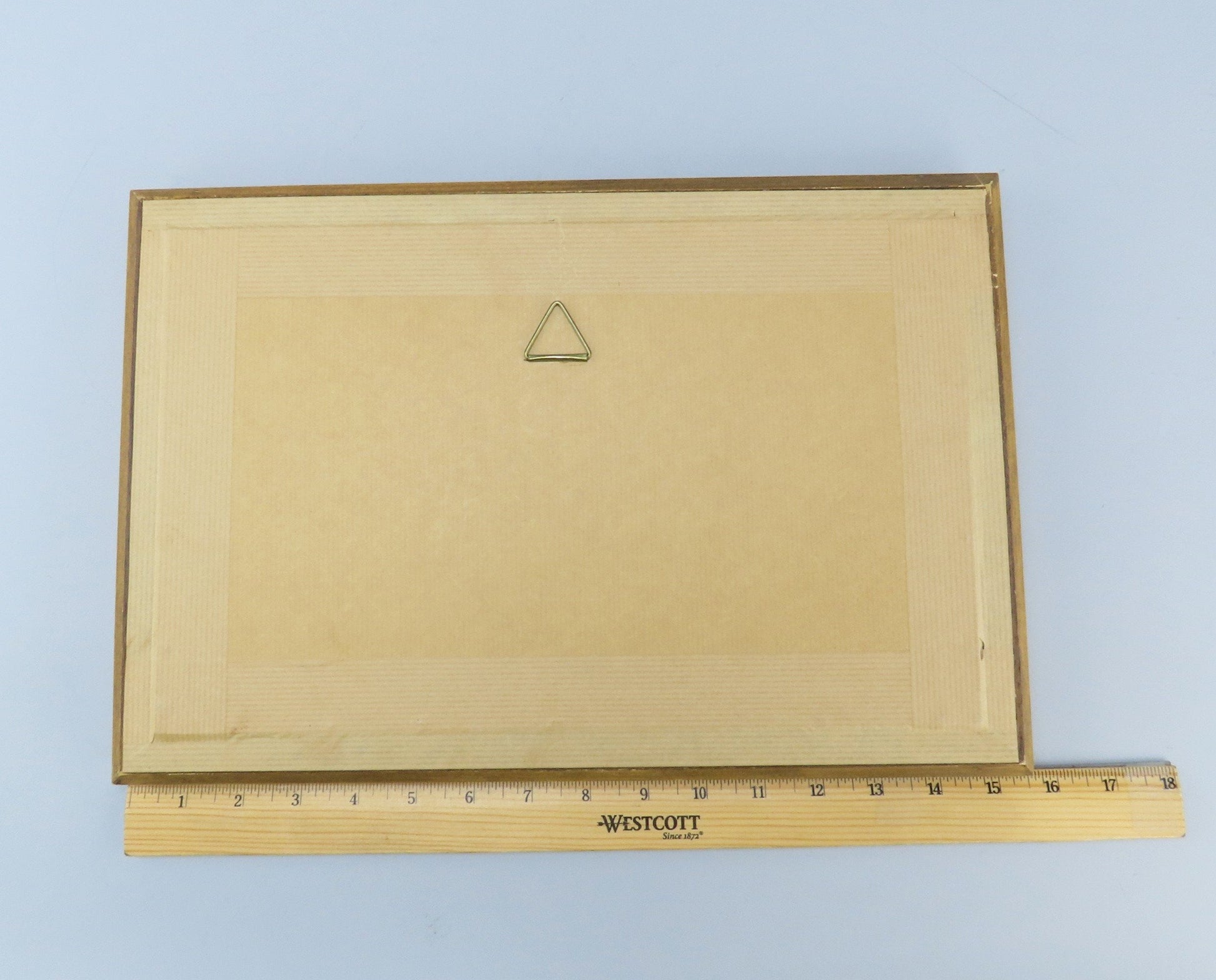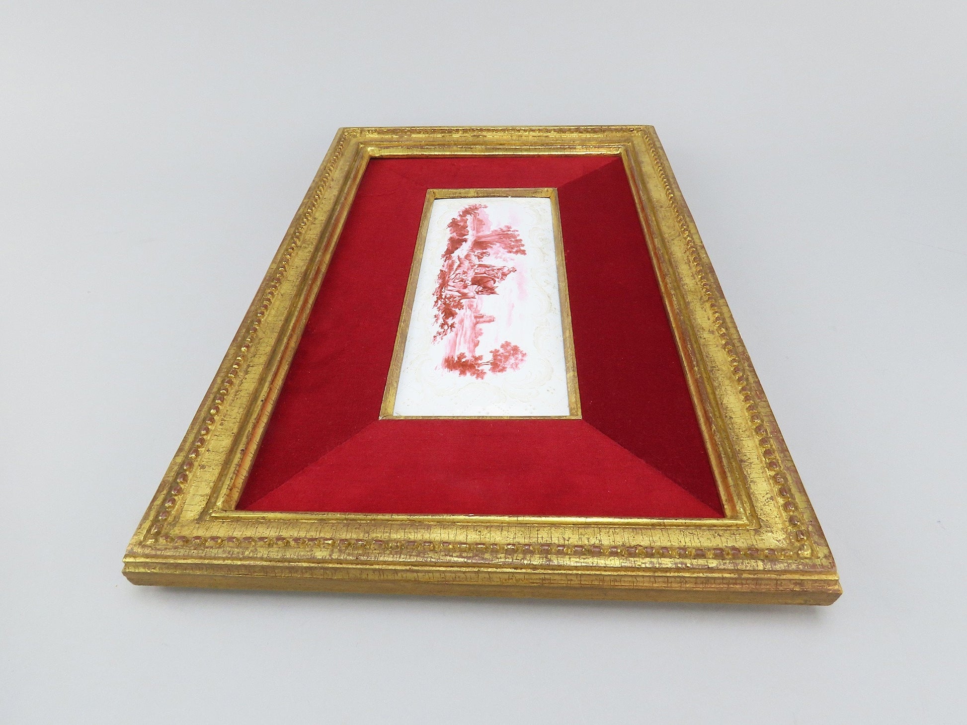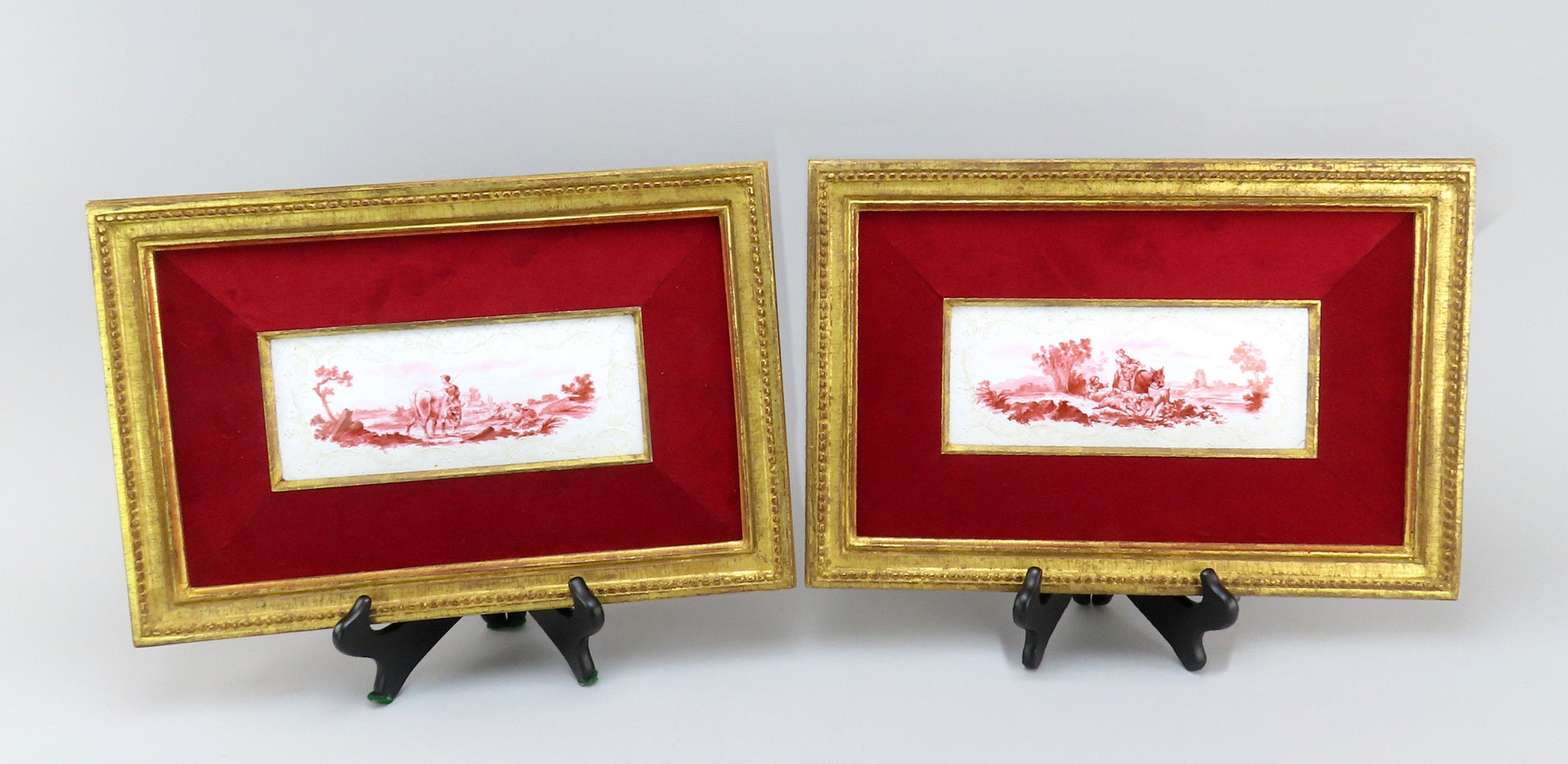 These framed plaques are in excellent condition. The plaques themselves have no visible chips or damage to the enamel. The gilding of the wooden frames is in great shape. One plaque has a cutout in the cardboard backing, but there does not appear to be a signature underneath.