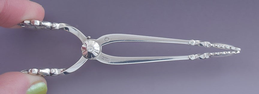 This piece is in great condition. The spring mechanism of the tongs is in great working order. There are no splits, no breaks, no dents, no monograms, no monogram removals, and no repairs.