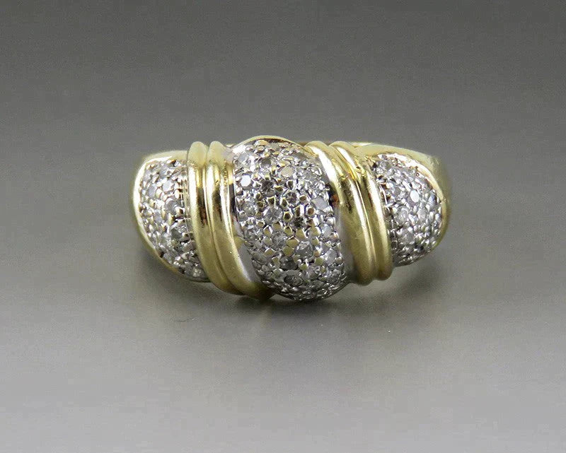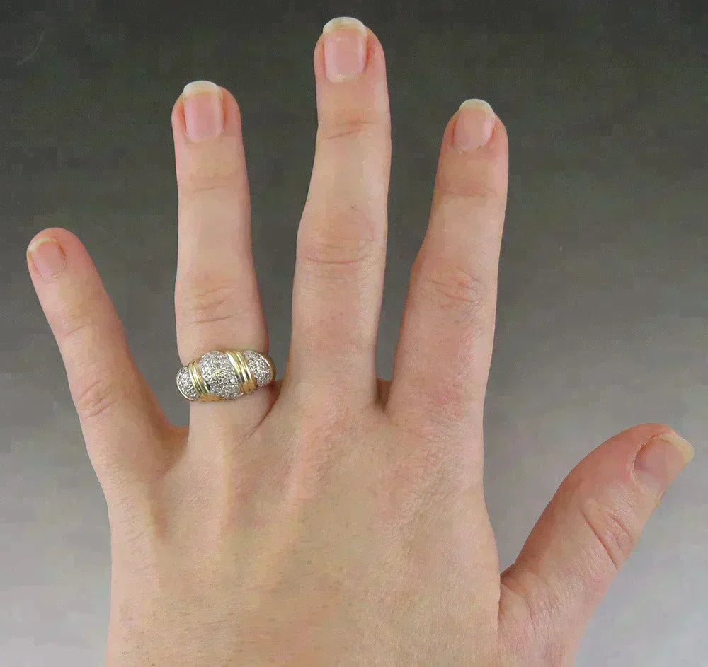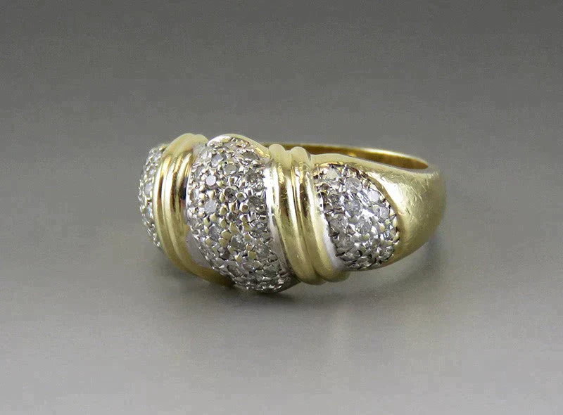 Presented is a very pretty, 14 karat yellow gold and natural diamond gemstone ring. The band is thick and the domed top is securely set in white gold with 56 natural diamonds. The stones are SI clarity and H-I color. There is at least 3/4 carat in total diamond weight. This ring is a size 7.5 and it can be resized by a professional jeweler.