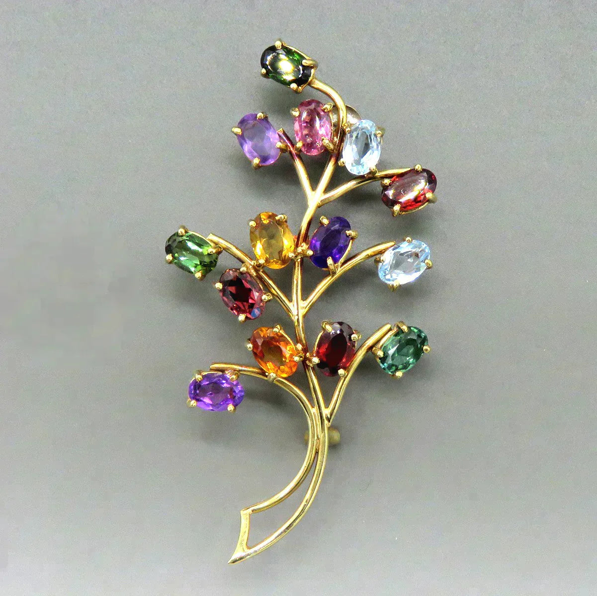 Fine Quality 18K Gold Natural Gemstone Flower Branch Brooch Pin by Stern