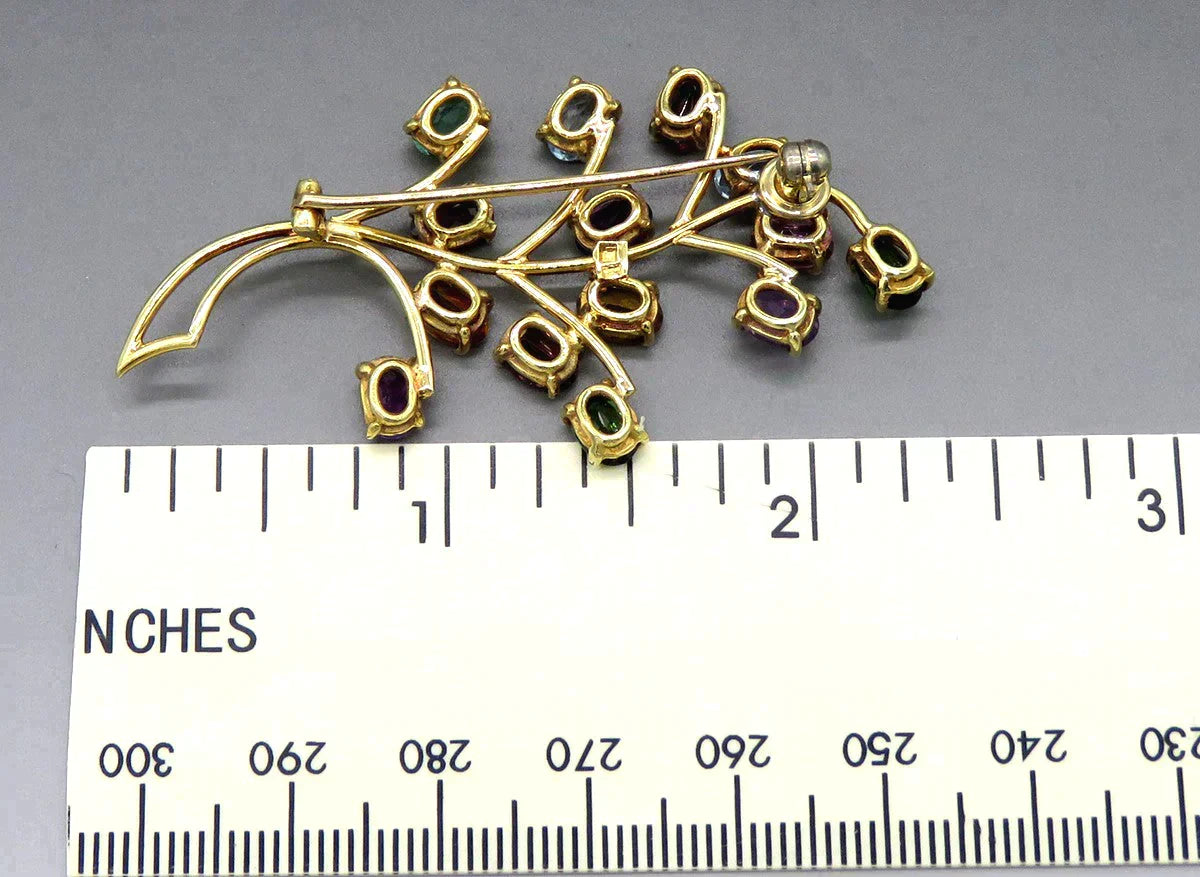 Presented is a gorgeous, 18 karat yellow gold and natural gemstone brooch or pin made by Stern in South America, probably Brazil. This pin was made between 1950 to the 1980s. The pin is securely prong set with 14 natural, faceted gemstones. The pin is done in the form of a bouquet of flower or branches of flowers. The rainbow of gemstones include amethyst, aquamarine, citrine, tourmaline, garnet, pink tourmaline and possibly others. The colors are vibrant, really nice stones.