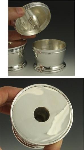 The piece measures 6 3/4 by 11 1/8 inches, is 3 1/2 inches tall and the sterling pieces alone without the glass liners weigh 1315 grams or 46.4 ounces. Tremendous weight.