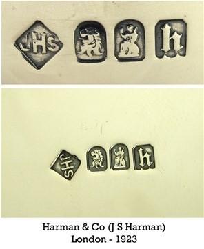 The base and two inkwells are marked with the lion’s head erased and Britannia mark for London and .958 purity silver (which is higher than .925 sterling purity), a date letter h for the year 1923 and a maker’s mark for Harman & Company.