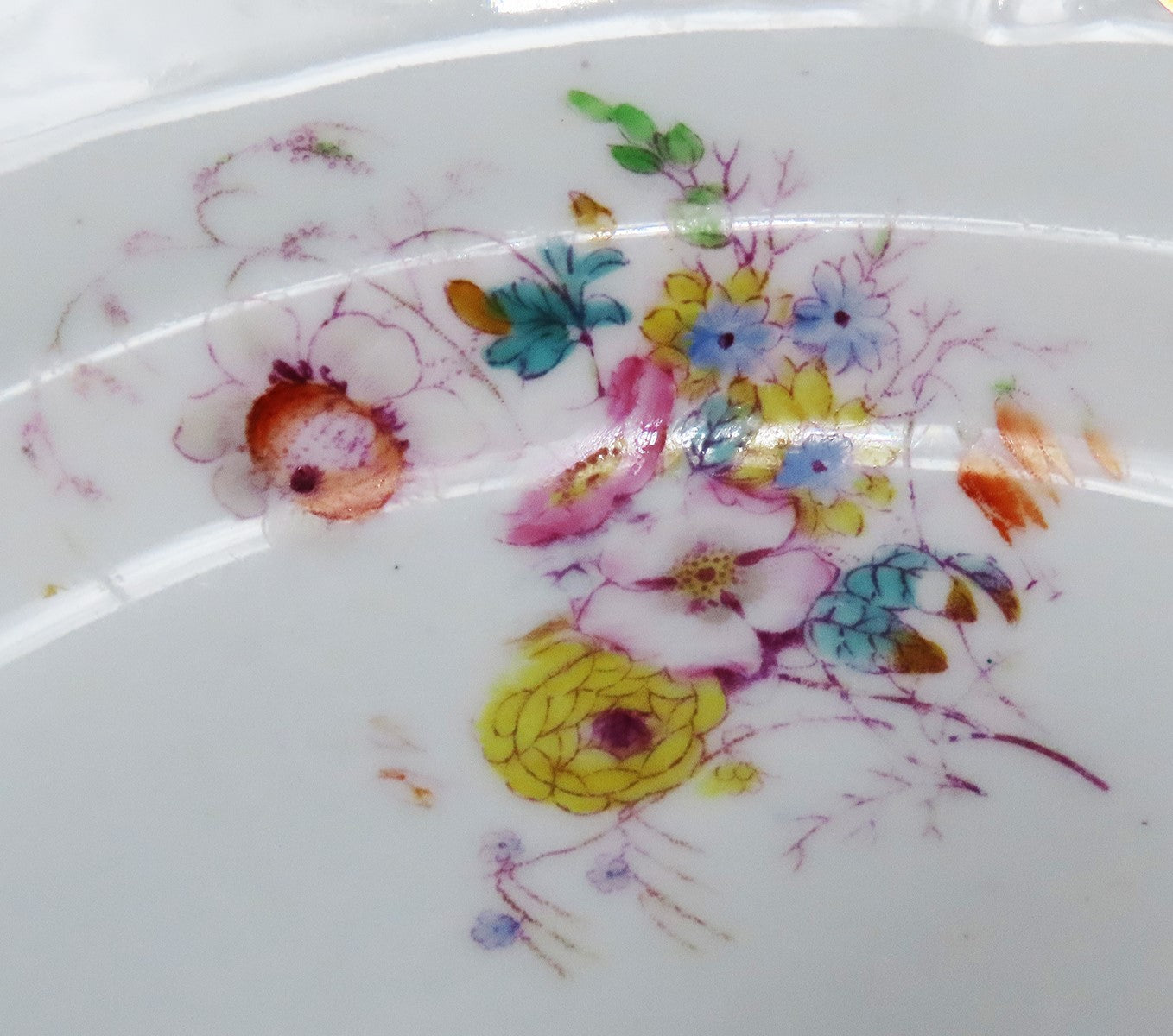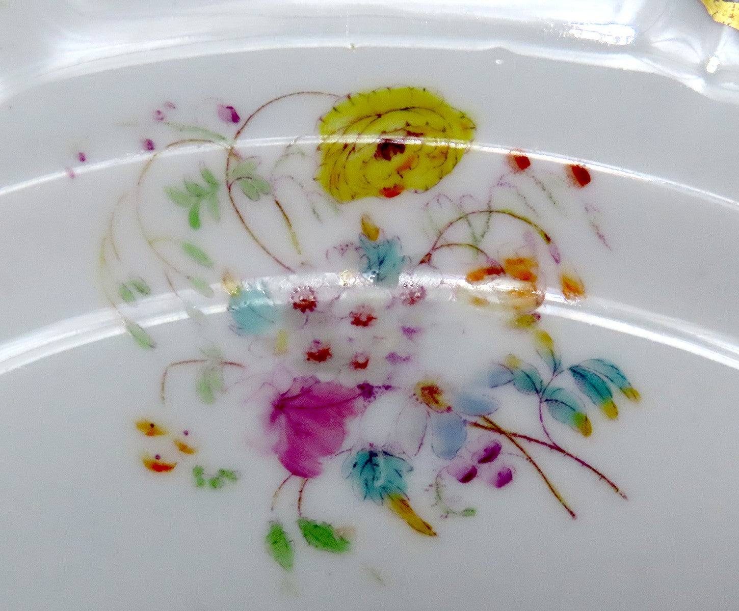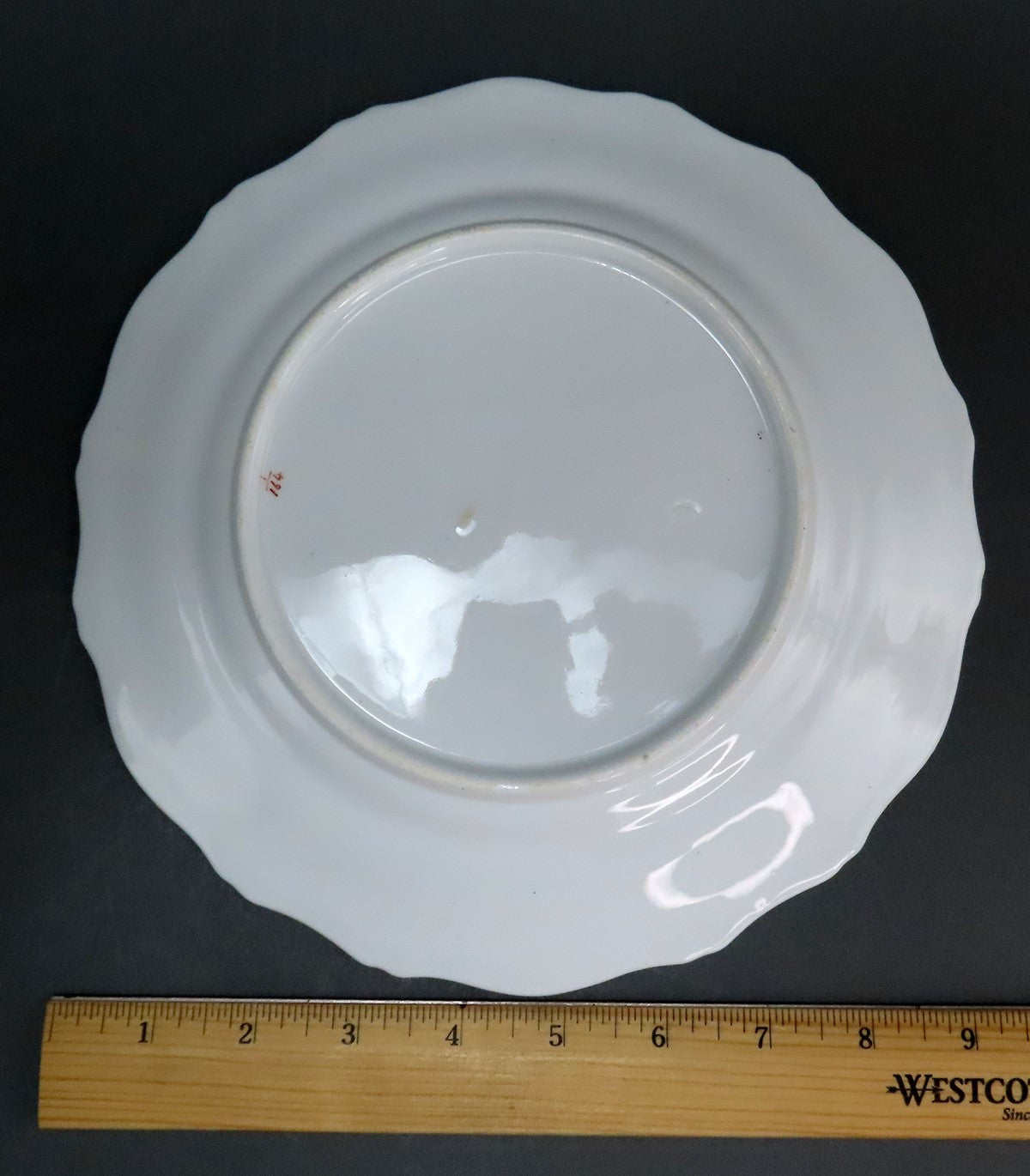 This set is in excellent overall condition, especially considering the age and material. The plates have some minor wear to the gilding and to the floral sprays here and there, mainly to the gilt circle around the center, which happens as a result of the plates being stored in a stack. One plate has some noticeable crazing, but not discoloration. The plates ring well when tapped. There are no chips, no cracks, no breaks, and no repairs.