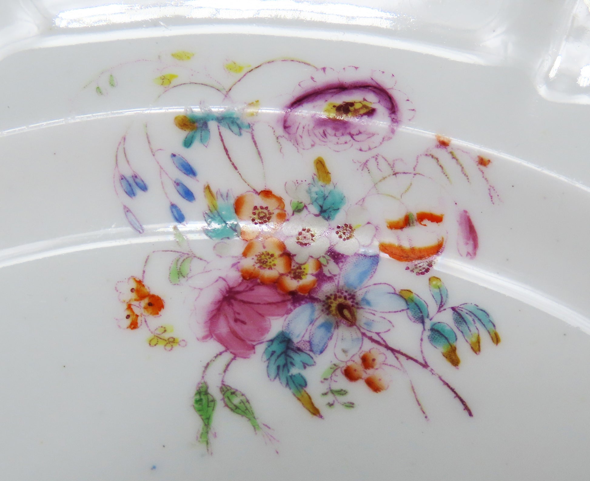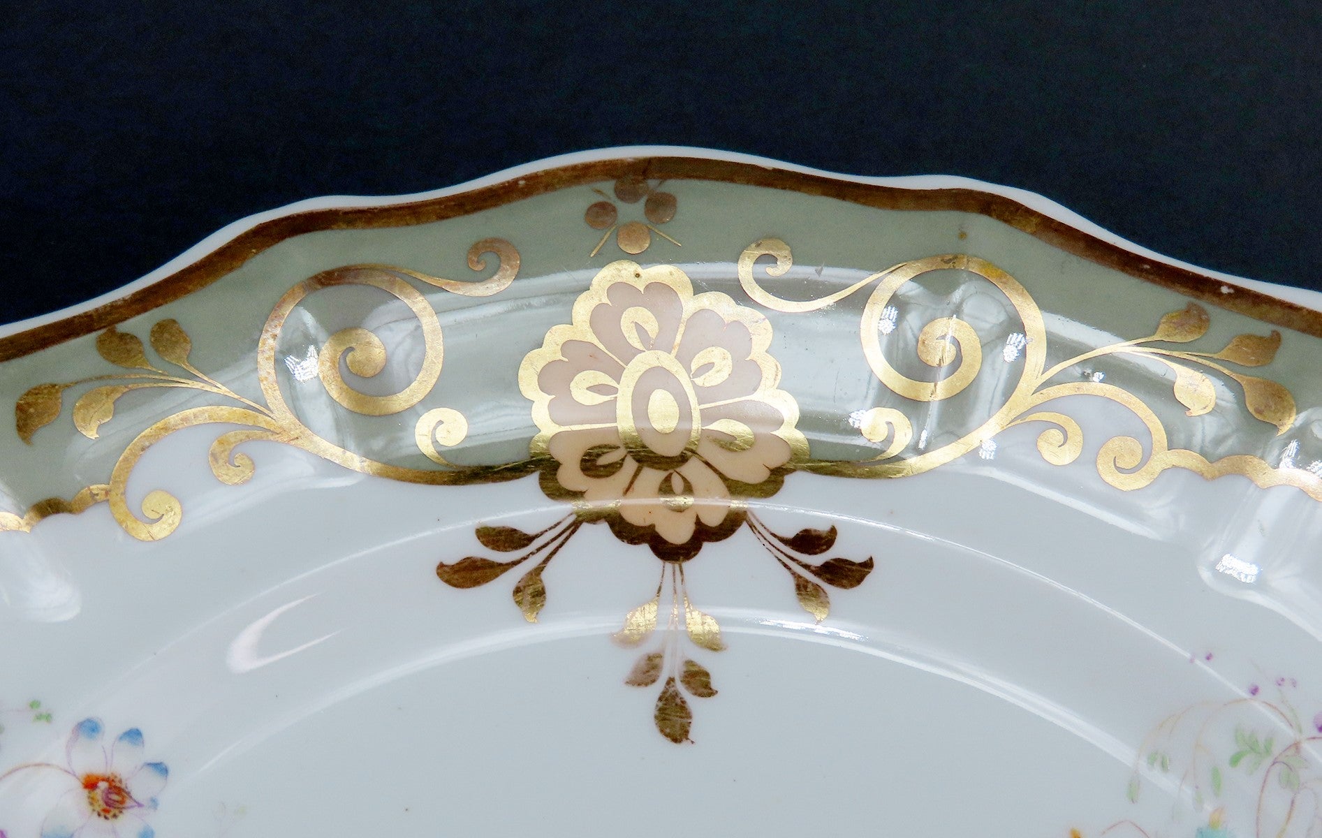 Presented is a fine set of 17 English Staffordshire porcelain plates, likely by Davenport. These plates date to around the 1830s-1850s, and for that time period would easily be considered dinner size, though by modern standards they fall more between lunch and dinner size. The plates are white with sage green rims, decorated with gilt scrollwork and florettes in a peach or light orange color. Around the center are little hand painted sprays of colorful flowers, in delicate spring shades of pink, blue, yellow, purple and green, no two exactly alike.