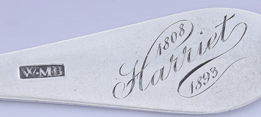 Each spoon is stamped with the maker's mark for William Mannerback, a Reading, Pennsylvania silversmith.