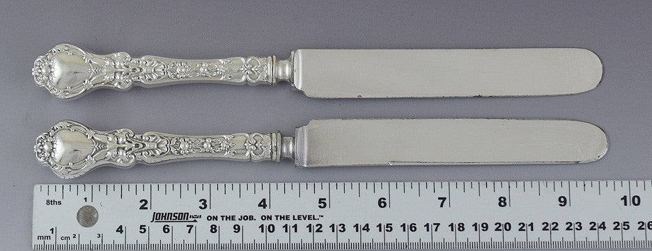 This set is in great overall condition. One knife has had its blade replaced with a stainless steel blade, but this replacement was professionally done and is quite hard to notice. The silver plated carbon steel blades are in great shape, with no corrosion or pitting and only the most minor of wear to the silver plating here and there. The handles have no splits, no breaks, no dents, no cracks, no monograms, no monogram removals, and no repairs.