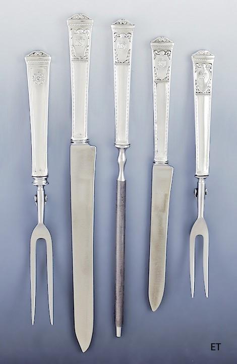 Presented is a wonderful Tiffany & Co 5 piece sterling silver carving set. This set is done in the elegant San Lorenzo pattern, which began production in 1916. This is an attractive pattern with a very Art Deco look. Each piece is monogrammed on the handle with JAN in overlapping lettering which almost looks like an abstract design rather than initials. The knives have carbon steel blades, with a razor sharp edge. The forks have stainless steel tines, with the fold-out stopper mechanism at the back.