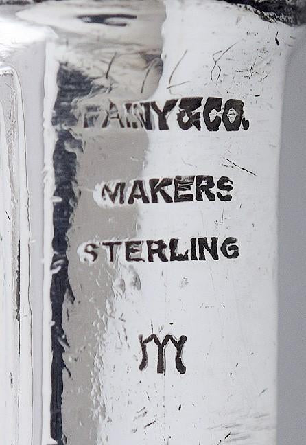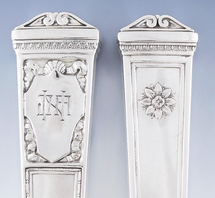 Each piece is stamped on the side of the handle beneath the collar with the Tiffany & Co. maker's mark, sterling and the initial 'M' for the company director between 1907-1947, John C. Moore II. The blades of the two knifes are marked Tiffany & Co. The tines of the two forks are marked 'stainless.'