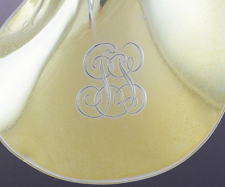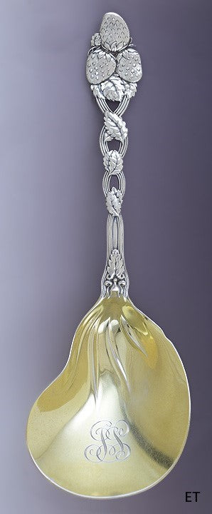 Presented is a wonderful Tiffany & Co sterling silver serving spoon. This piece is made in the beautiful Strawberry pattern, which as the name suggests features designs of strawberries and vines in high relief on the handle. The server has a kidney-shaped bowl with a rich gold wash. The bowl of the server is done in a stylized oyster-shell type of design. The blade has a monogram of JS on the front.