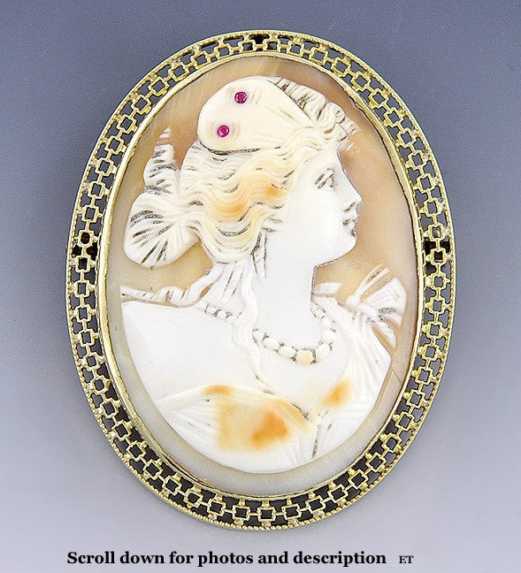 Presented is a Victorian, 10 karat yellow gold and hand carved shell cameo brooch/pin or pendant from the late 1800s or very early 1900s. The solid gold mounting is done in a wonderful, openwork design, like brickwork or something similarly geometric. The bezel set cameo is carved into the form of a lovely young woman in a 19th century style, very detailed and well done, with two tiny red stones set in her hair ornament. There is a hinged bale or loop on the top to hang the piece as a pendant. The clasp has a safety latch for added security.