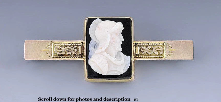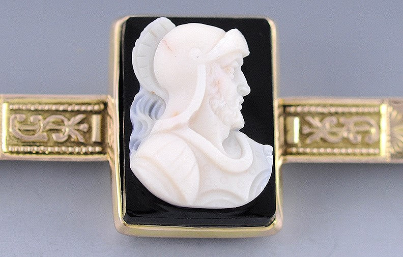 Fine Victorian Carved Roman Warrior Stone Cameo 10k Yellow Gold Bar Pin