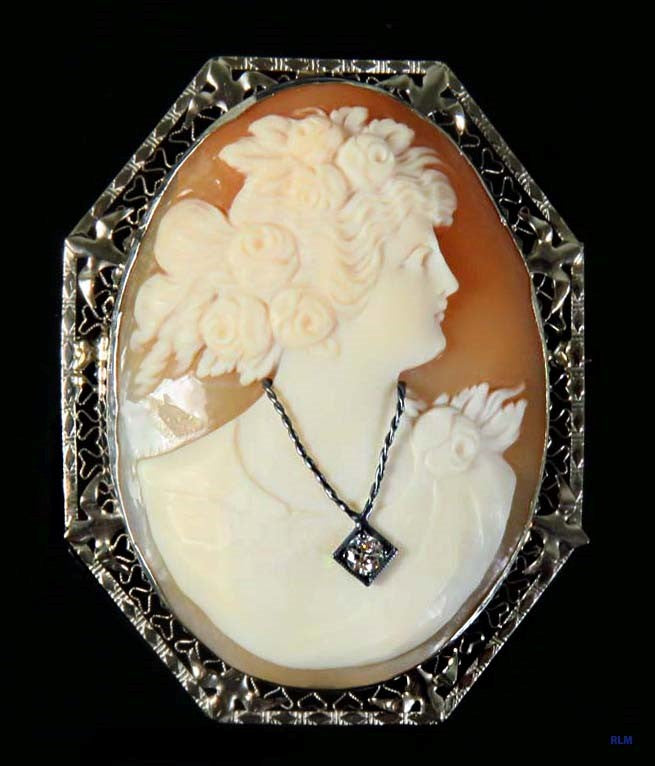 Presented is a nice vintage American 14k white gold cameo pin/pendant. This pin/pendant is well made. The cameo has a beautiful necklace with an old mine cut diamond that's about 10 points. This pin is done in an octagonal shape.