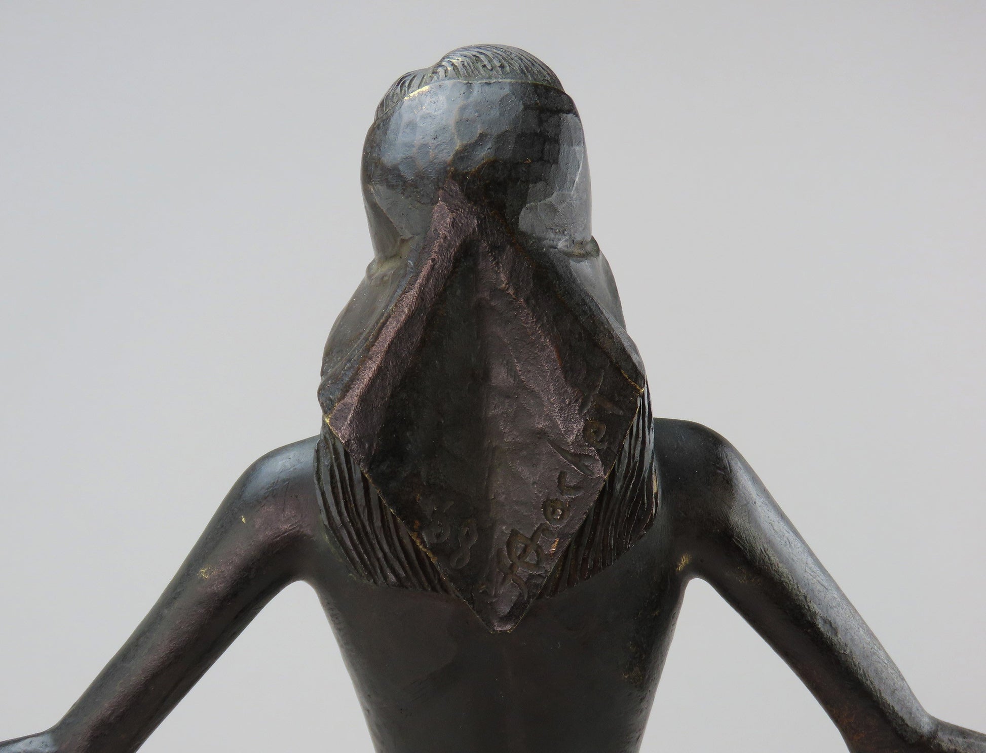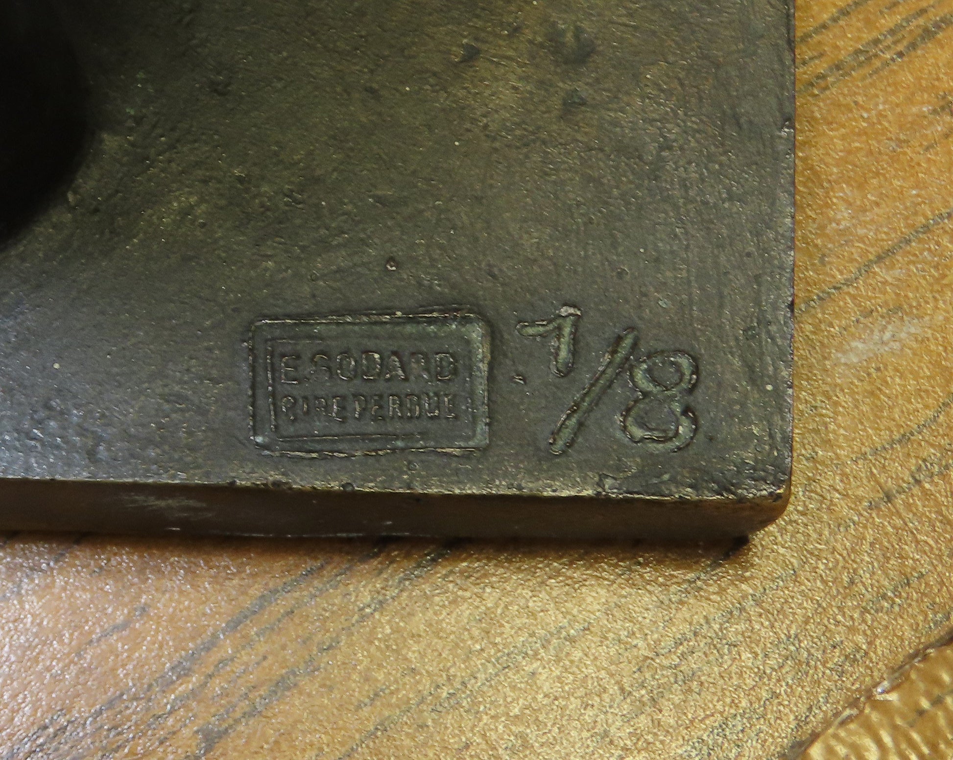This piece is stamped on the top side of the base with the foundry mark for E. Godard, “cire perdue” for “lost wax,” and the numbering of the piece, 7 out of 8 or possibly 1 out of 8. The woman's kerchief is signed F. Brochet, for Francois Brochet.