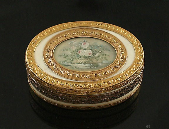 Presented is an elegant French 18k gold, oxbone and silver box. Two of the gold bands, the one around the very top and around the very bottom as well as the oval band around the miniature painting of flowers, are solid 18K gold. The other two metal bands above and below the rim are gilt silver. The interior structure of the box is made out of silver, and the box has been lined with oxbone on the interior and the exterior. The lid of the box is mounted with a little miniature painting depicting a basket of roses and other flowers. The interior of the box has a mirror on the top and three compartments on the bottom. Two of the compartments have hinged covers made out of oxbone. They were probably made to store powder or rouge. The box was made in France between 1783 to 1789. This box is at least 220 years old.