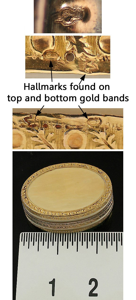 The box is hallmarked on the gilt silver, on the interior rim, with a bird's head hallmark. This is the small article discharge mark for Paris that was in use between 1783 to 1789. This hallmark was only stamped after the tax was collected. Other hallmarks are not present almost certainly because of the size of the box. There is really no where to stamp any hallmark of any significant size. The discharge mark indicates that this article is silver, approximately sterling purity. There are also hallmarks on both the top and bottom 18 karat gold bands. The hallmarks are so small that they are difficult to photo, but one appears to be a leaf and the other appears to be an animal's head.