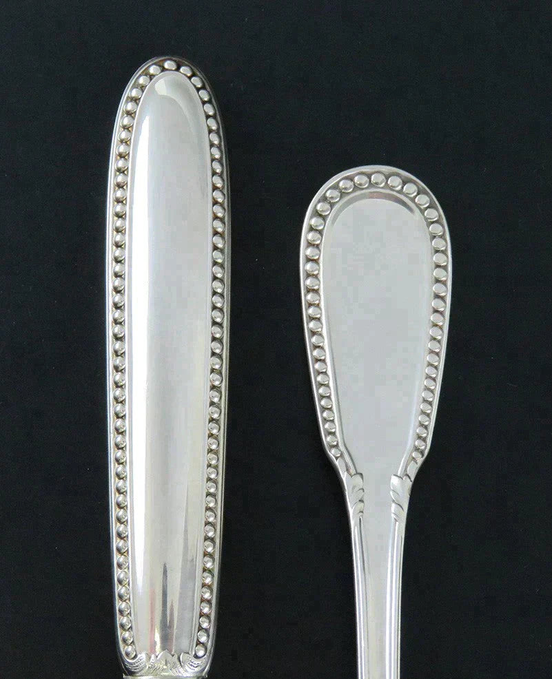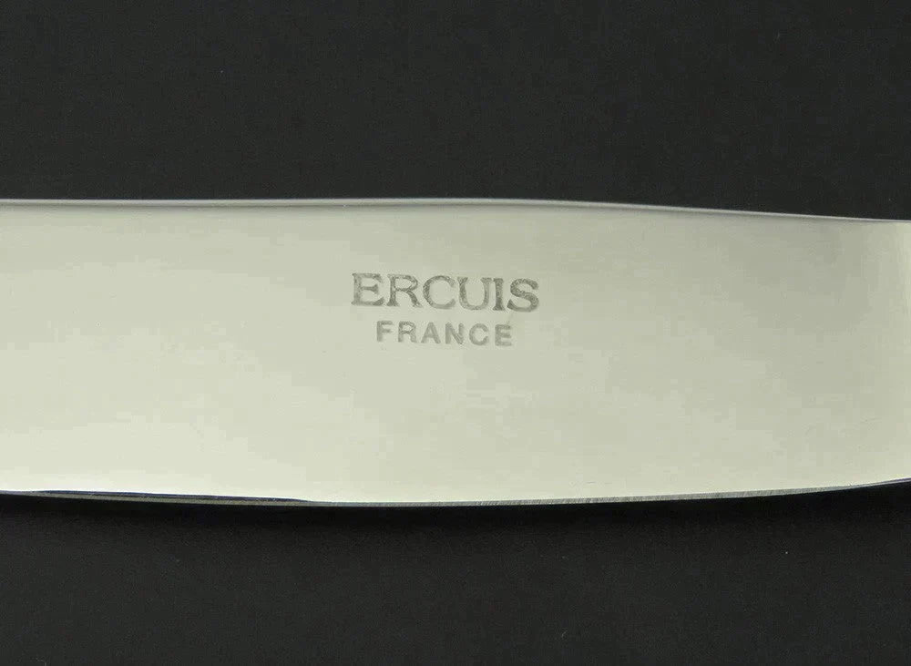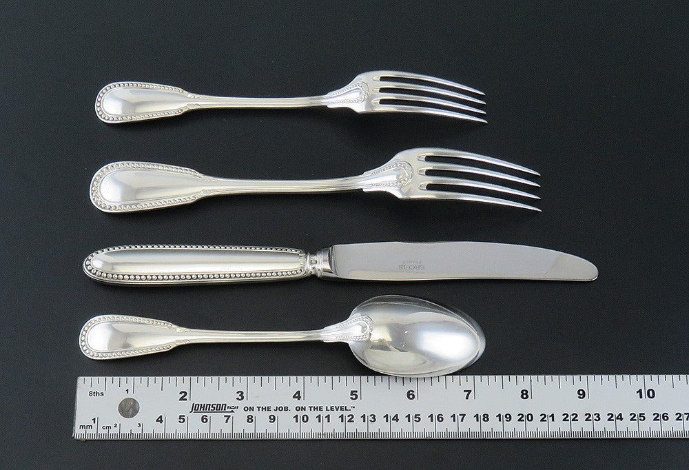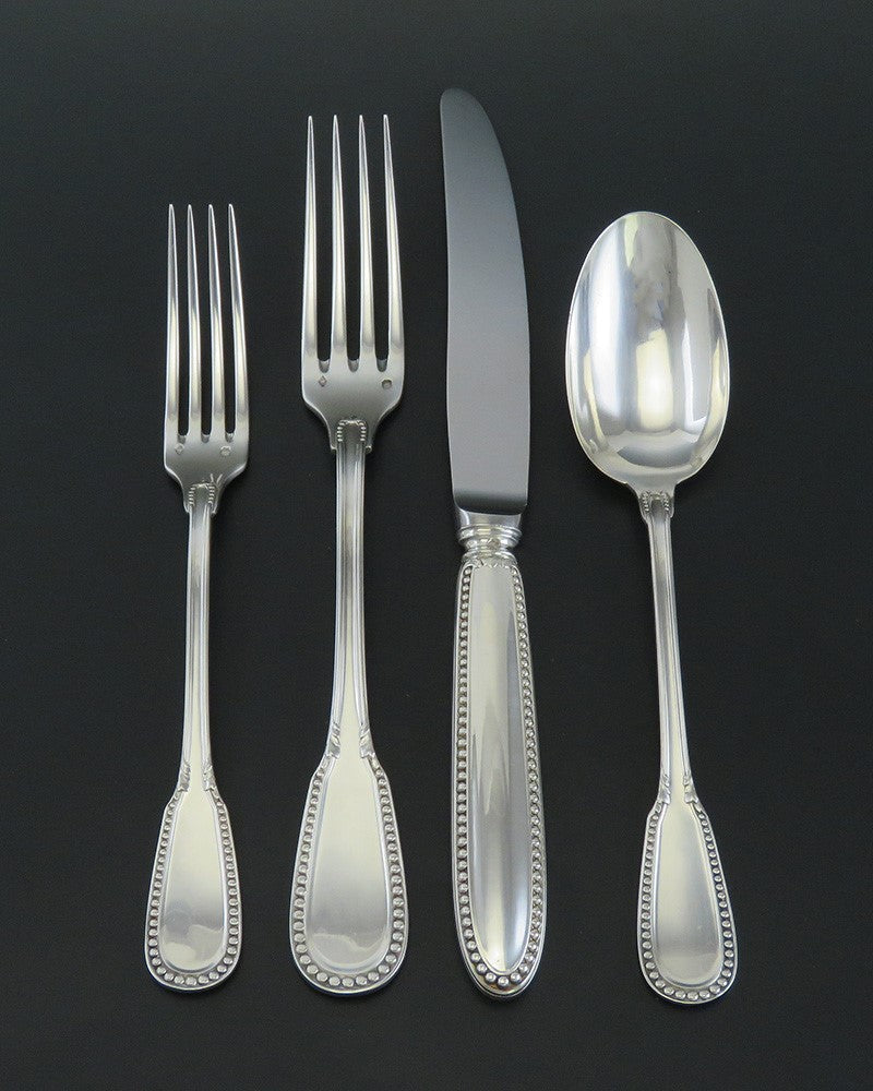 Presented is a very fine quality, French silver flatware set made by Ercuis. This set includes a place, table or oval soup spoon, a salad/lunch fork, a dinner fork and a dinner knife. The pieces are in the Lafayette pattern. Each handle has a beaded edge and the pieces have never been monogrammed.