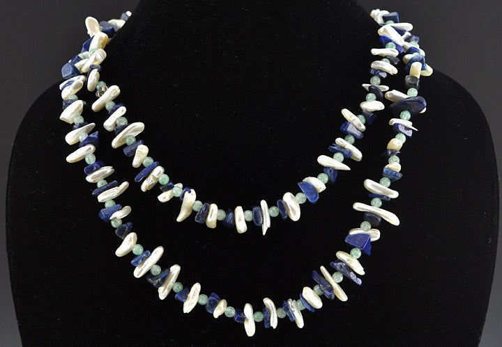 Genuine Pearl Lapis Aventurine Stone Necklace 36.5"