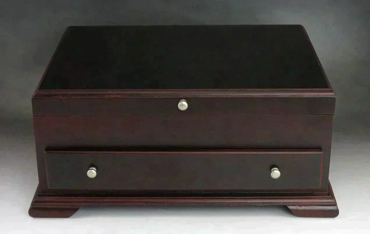 the photos. The chest is wood in a rich dark walnut finish, with a velvet lined