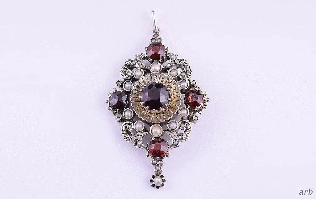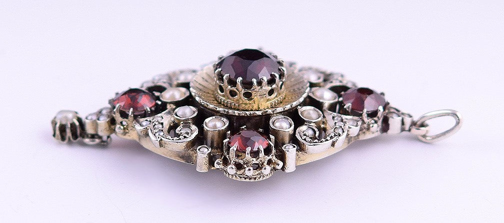 The top garnet is enhanced by a round silvery setting. Surrounding this stone are natural seed pearls and 4 more glistening deep red garnets.