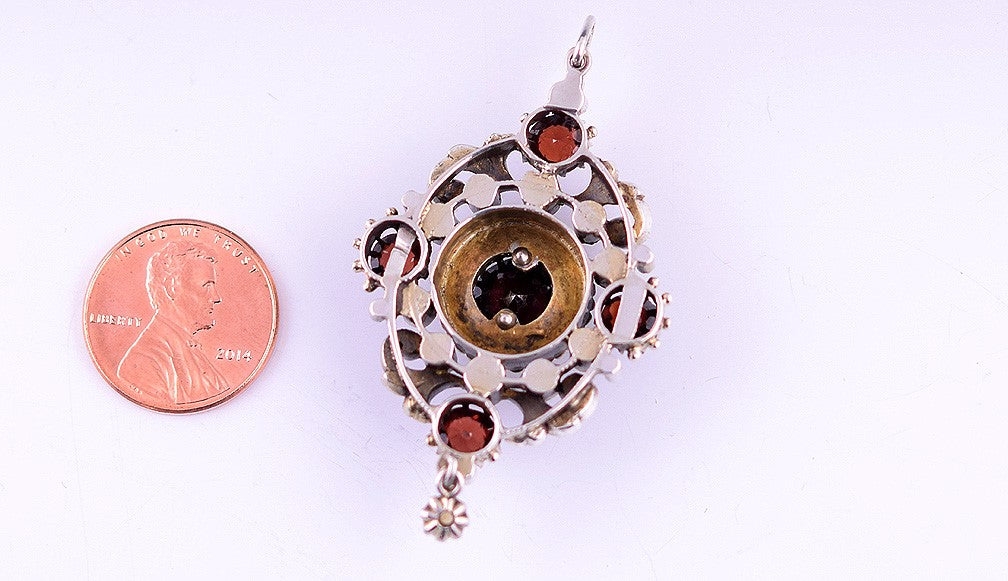 Glistening Silvery Pendant Set w/ 5 Large Garnets and Natural Seed Pearls