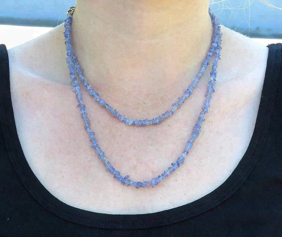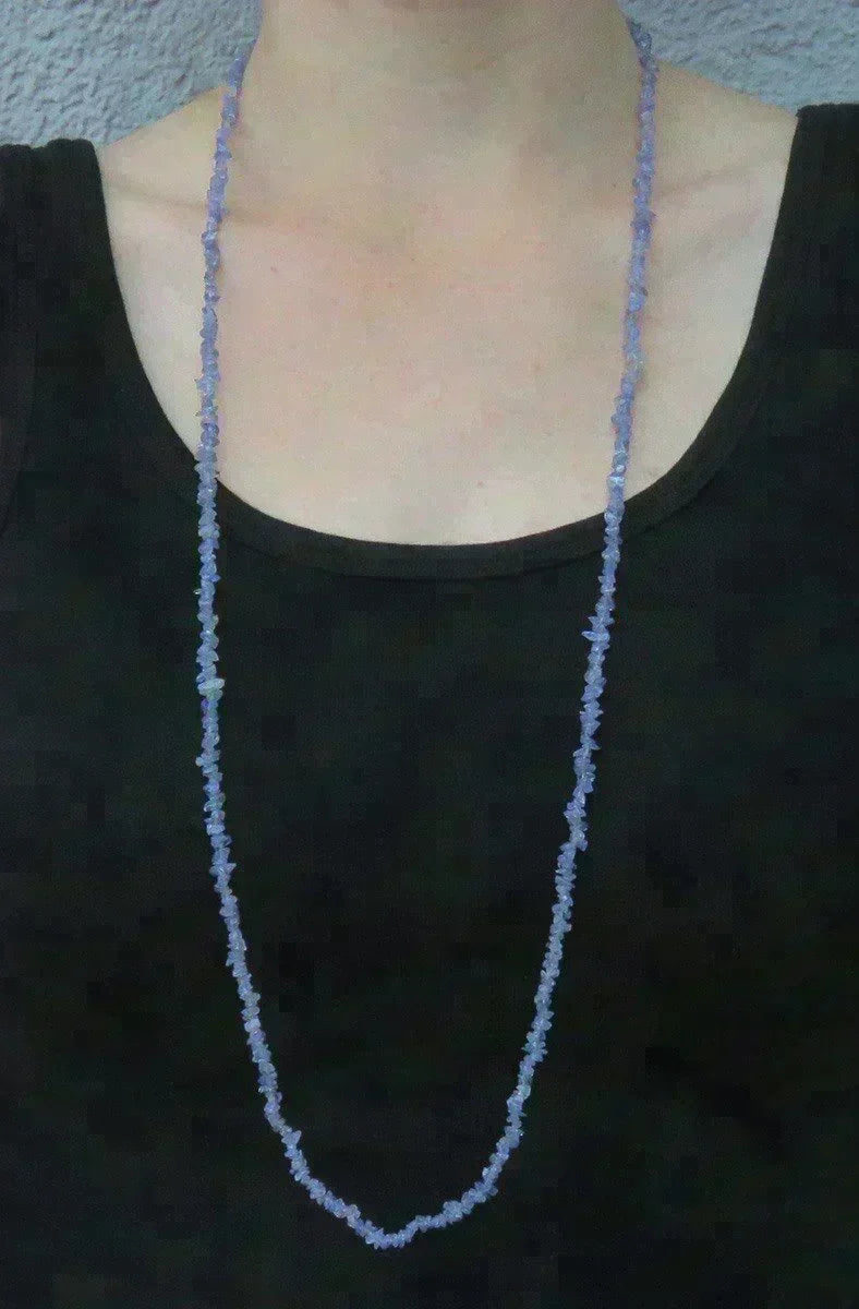 Presented is a long tanzanite necklace made with tumbled roughly-shaped bits of