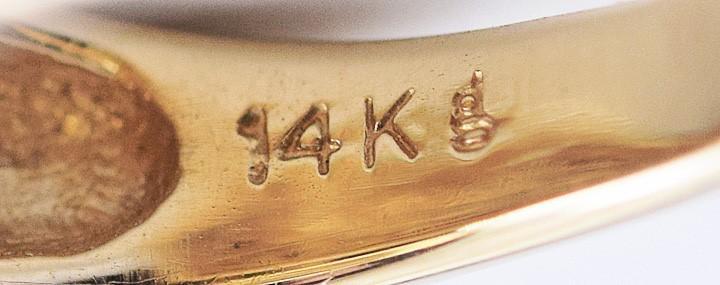 The band is stamped and guaranteed 14k and has a maker's mark of a lowercase g.