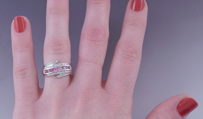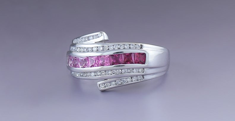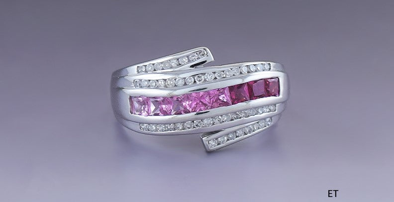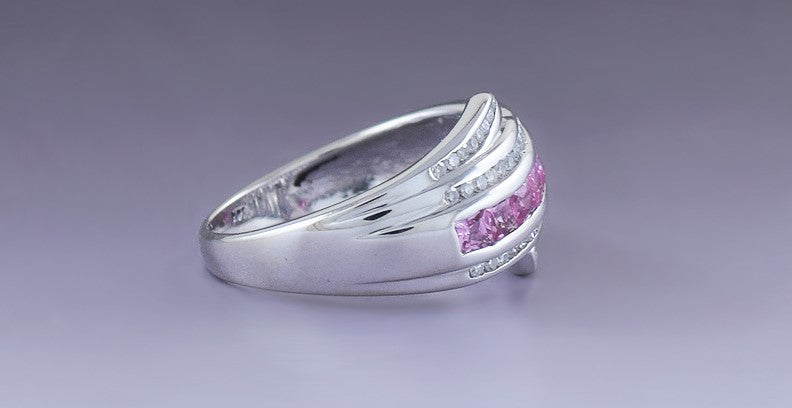 Presented is a gorgeous 14 karat white gold, sapphire and diamond ring. This is a modern ring, likely of American make. The ring is channel set with a row of eight square cut sapphires, ranging from a delicate light pink to a richer, deeper shade of pink. These sapphires are beautifully cut, with stunning clarity, and are about 10 points each in size, for a total carat weigh of about 80 points, or at least three quarters (¾) of a carat. Above and below the row of sapphires are rows of dazzling single cut diamonds, 48 in total, with a total carat weight of about half a carat. The setting is done in a sleek design like a coiled ribbon, very stylish.