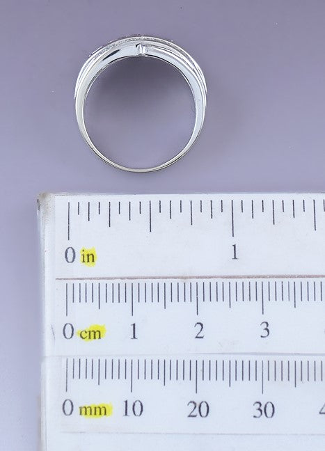 The ring is a size 7. The ring is about 11.8 millimeters wide at the widest point, and about 2.5 millimeters wide at the narrowest point. The ring weighs 4.9 grams.