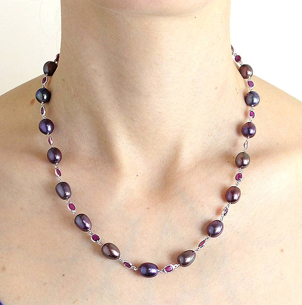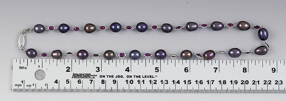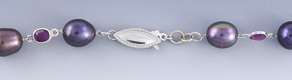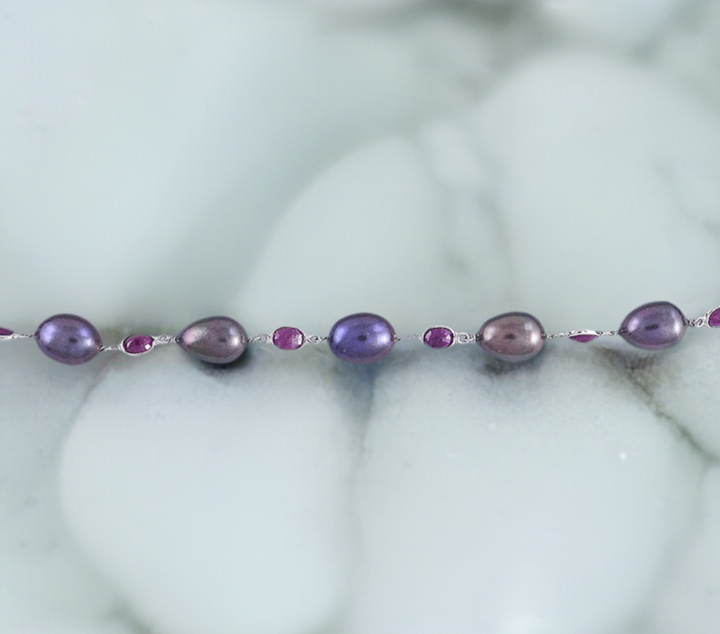 Gorgeous 14k White Gold Multicolor Peacock Purple Pearl & Ruby Necklace