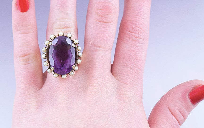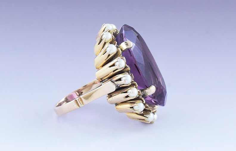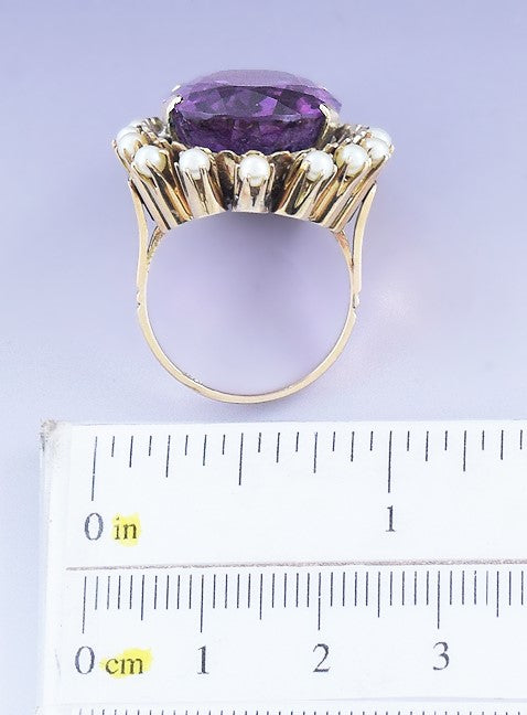 Presented is a gorgeous 14 karat gold, amethyst and seed pearl ring. This piece dates to around the 1950s and was likely made in Argentina. The ring is set with an oval cut amethyst, about 19.33 carats in size. This is a real, mined-from-the-ground stone with rich purple color, beautifully faceted to maximize its gorgeous depth and clarity. The amethyst is surrounded by 16 seed pearls.