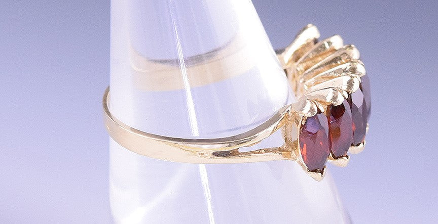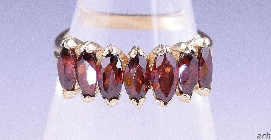 There are 7 genuine, prong-set, deep red, marquis-cut garnets on this ring.