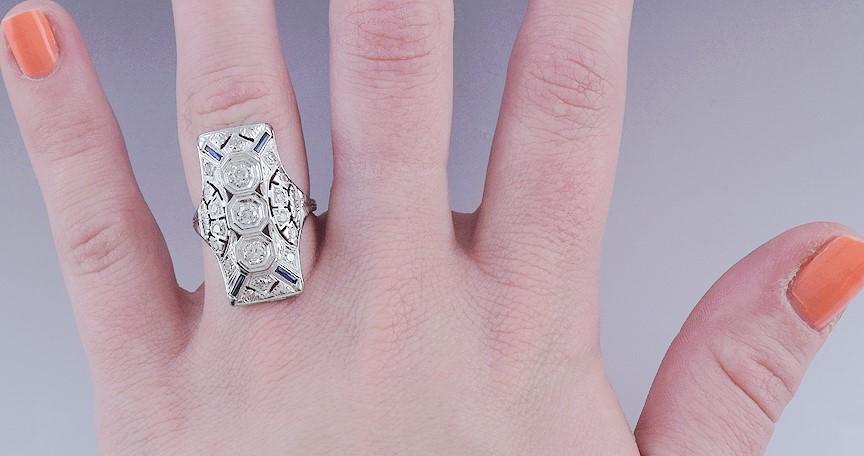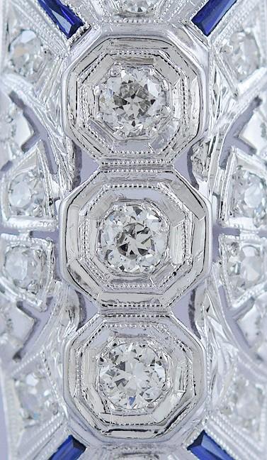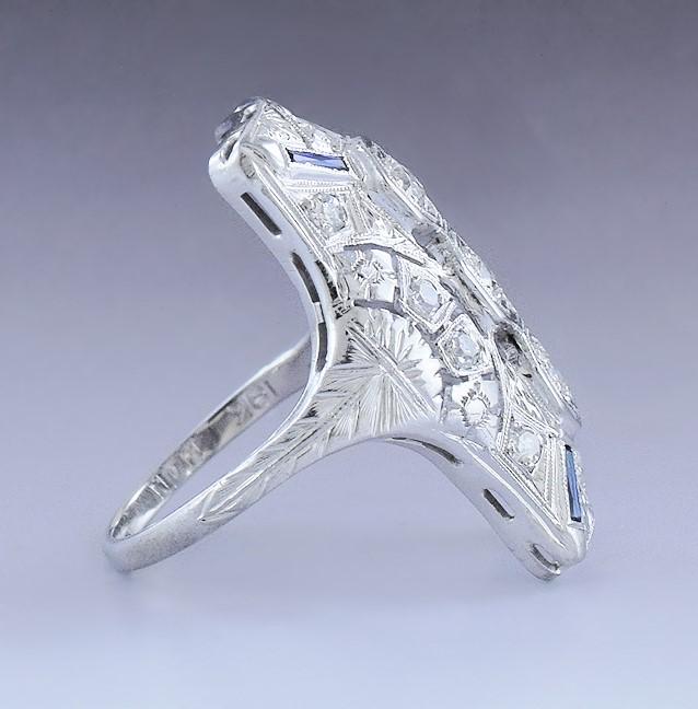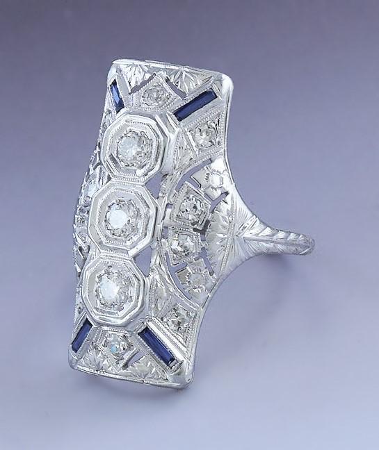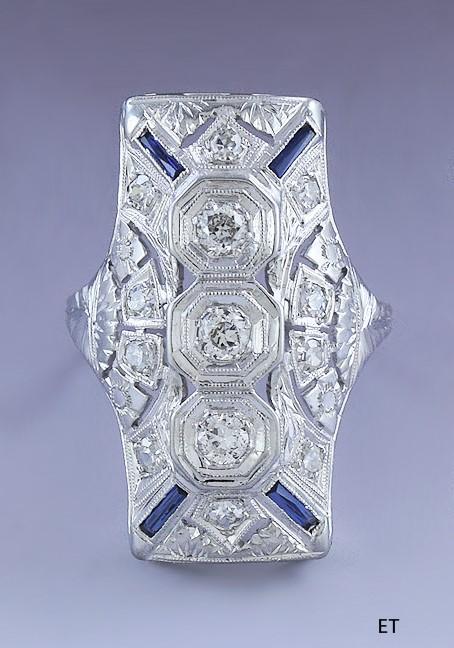 The ring is in great condition. The diamonds and sapphires are all intact,