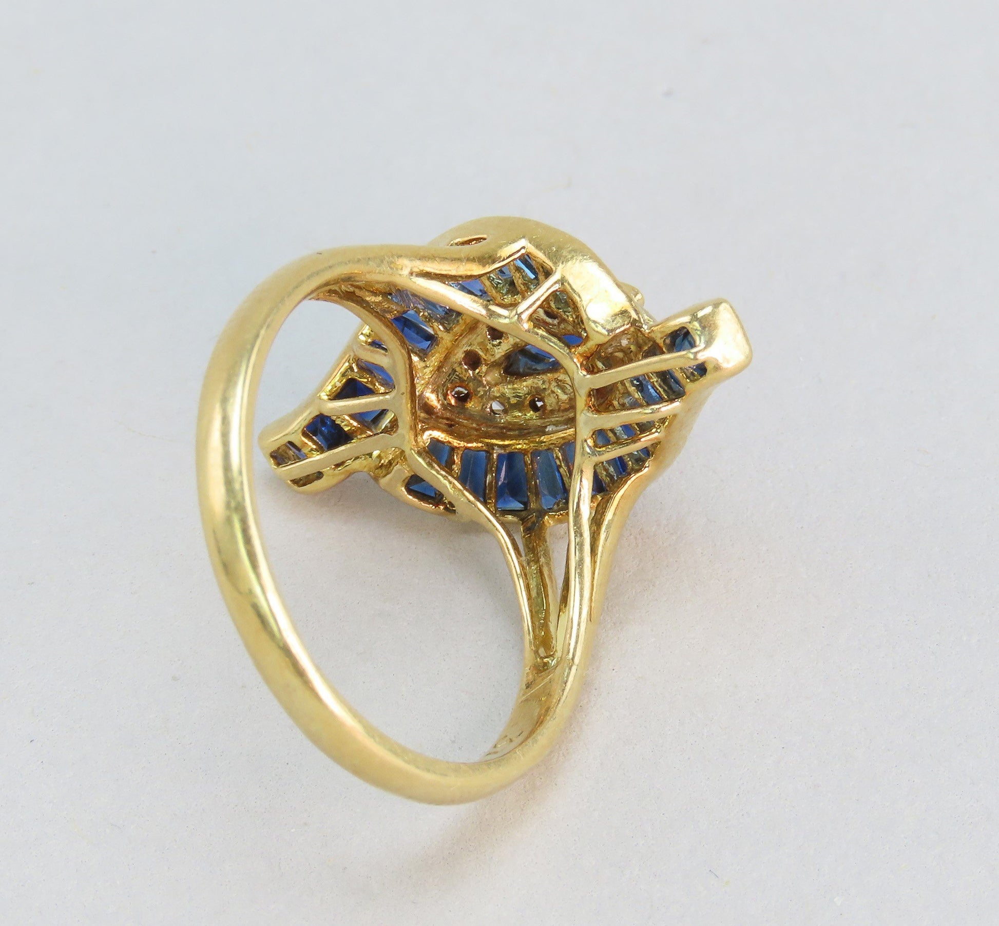 Presented is a lovely 18 karat yellow gold, sapphire and diamond ring. The ring is set with a gorgeous marquise cut sapphire, surrounded by 12 diamonds, with two channels of baguette cut sapphires (24 total) on the outside. The center marquise sapphire measurs about 5.4 by 2.9 millimeters, about 17 points in weight, while the exterior border of sapphires are 2-3 points each in size, for a total sapphire weight of at least 66 points (two thirds of a carat) at a very conservative estimate. The sapphires are well matched in their beautiful rich blue color, and catch the light very attractively. The diamonds are vibrant, dazzling single cut stones, totaling 8-10 points in weight, and make a very appealing contrast with the blue sapphires and deep yellow 18k gold.