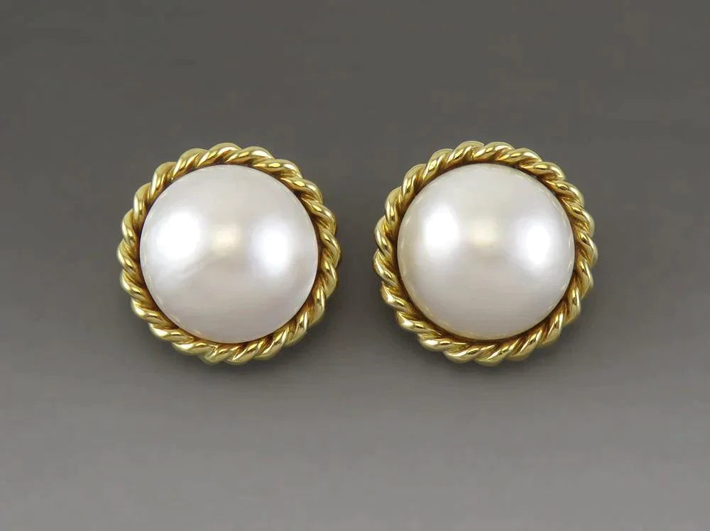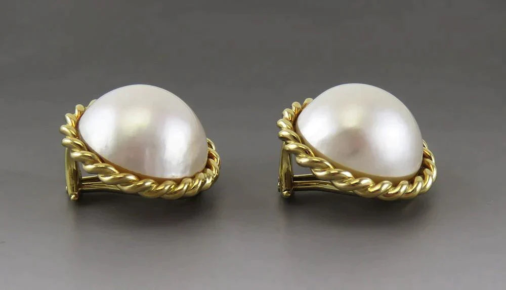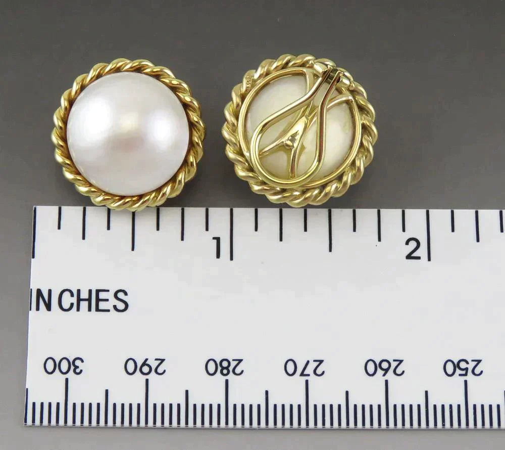 Gorgeous 18K Yellow Gold & Mabe Pearl Omega Back Statement Earrings