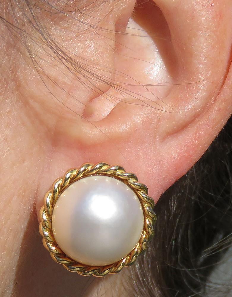 Presented is a beautiful pair of 18 karat yellow gold and mabe pearl earrings made around the late 1900s. Each earring has a rope or twist form mounting made of 18 karat yellow gold and the center is bezel set with a mabe pearl. The backs have strong and secure Omega backings, so you can wear these earrings even with un-pierced ears.